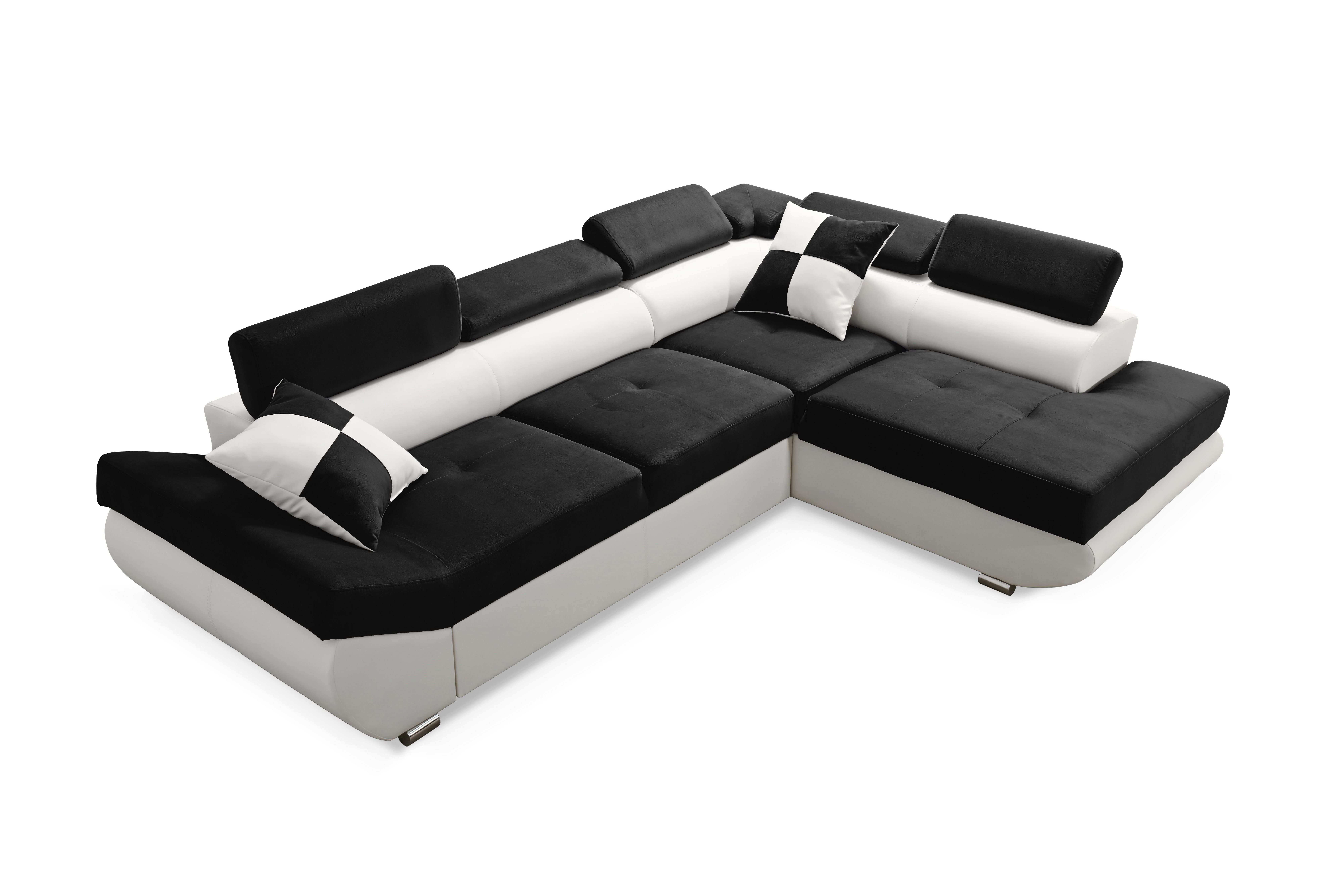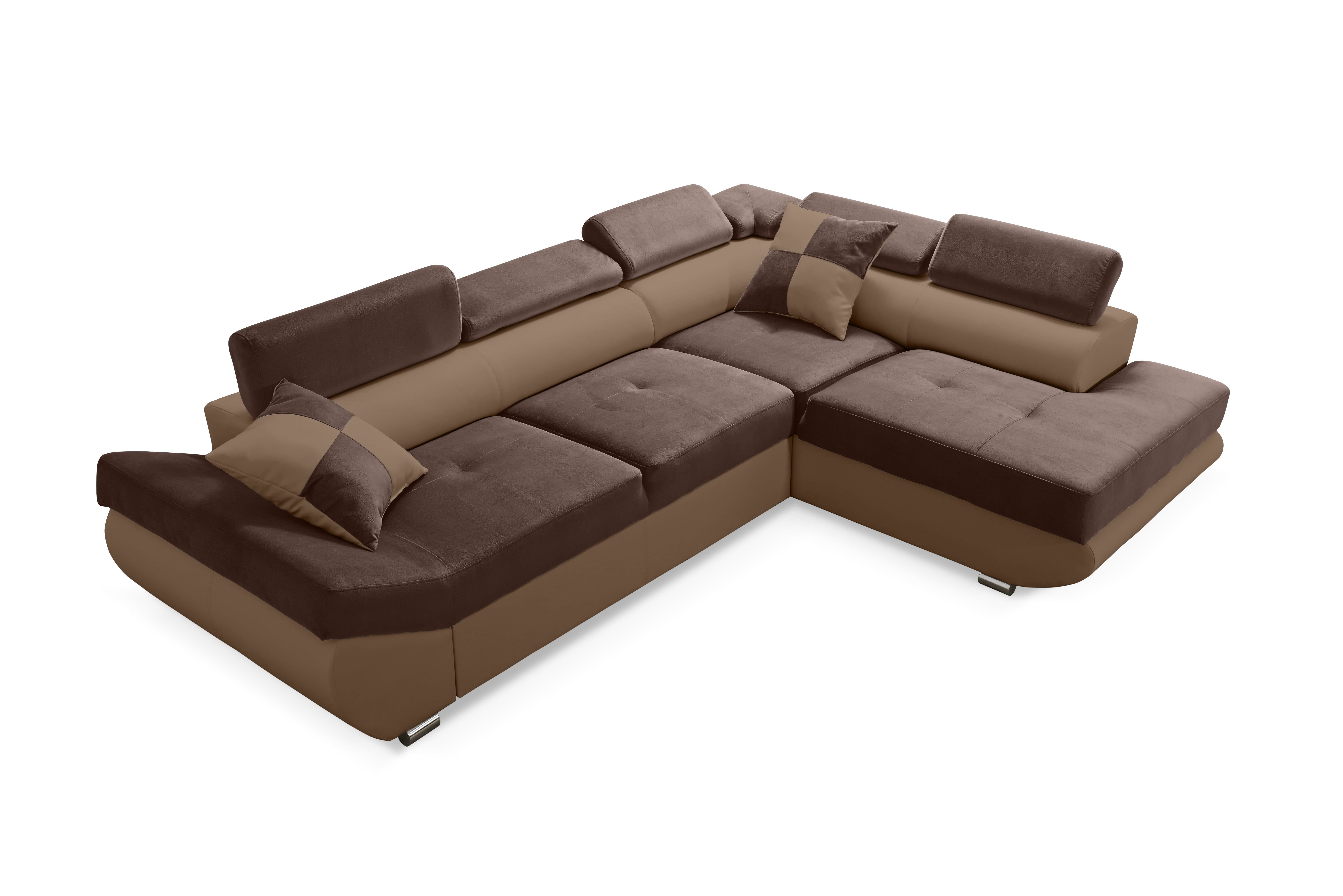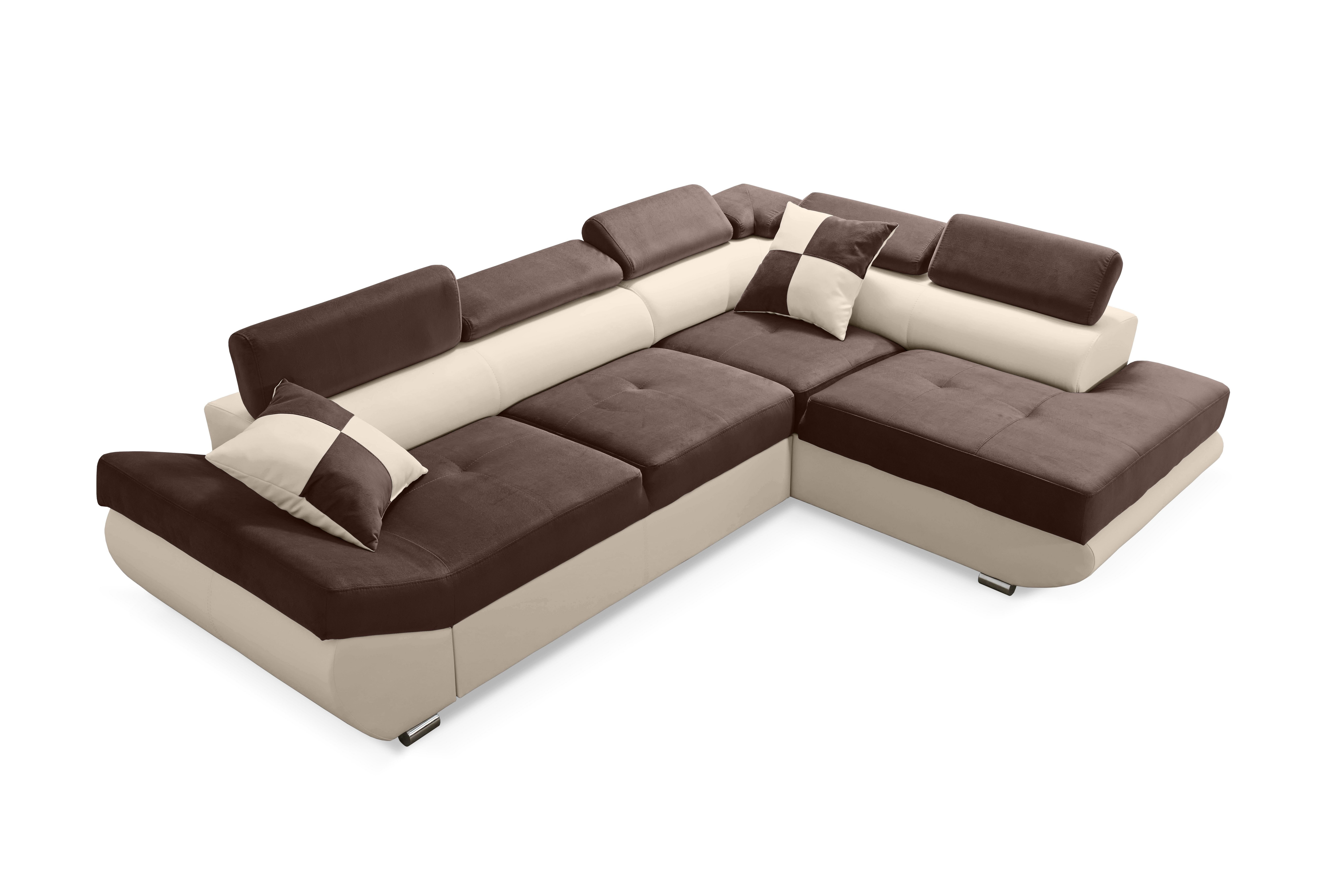 Das Robin Saturn Ecksofa mit Schlaffunktion, Bettkasten, 5 verstellbaren Kopfstützen und 2 Kissen bietet reichlich Platz für Familien oder Gäste. Dank der L-Form kann der Raum optimal ausgenutzt werden, indem das Sofa in eine Ecke platziert oder in der Zimmermitte aufgestellt wird. Die Schlaffunktion ermöglicht es, das Sofa einfach in ein bequemes Bett zu verwandeln, ideal für Übernachtungsgäste. Mit Wellenfeder, hochelastischem Schaum und verstellbaren Kopfstützen bietet es hohen Komfort. Das stilvolle Design passt zu jedem Wohnstil, und die Herstellung in der EU garantiert Qualität und Эко-товары.
