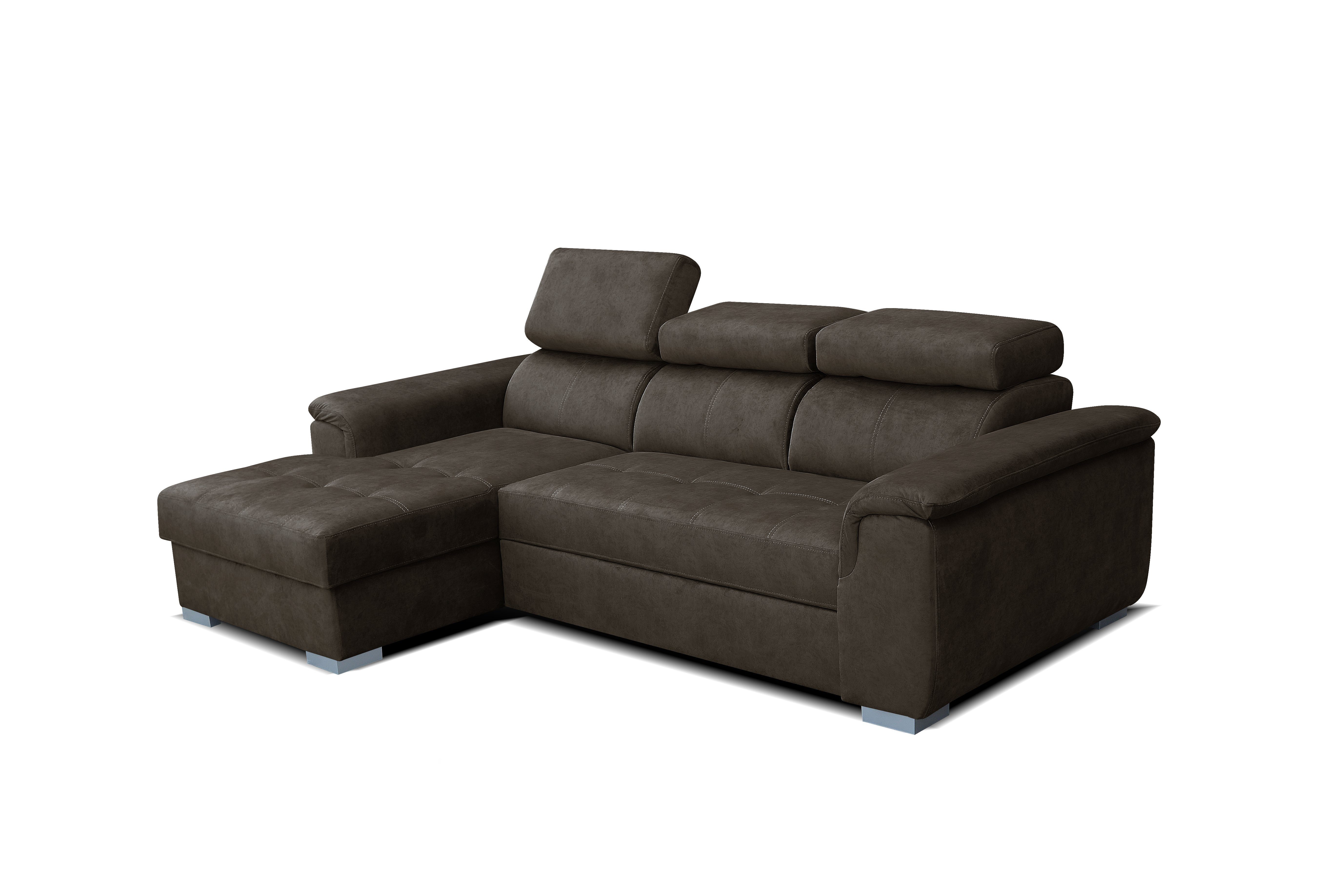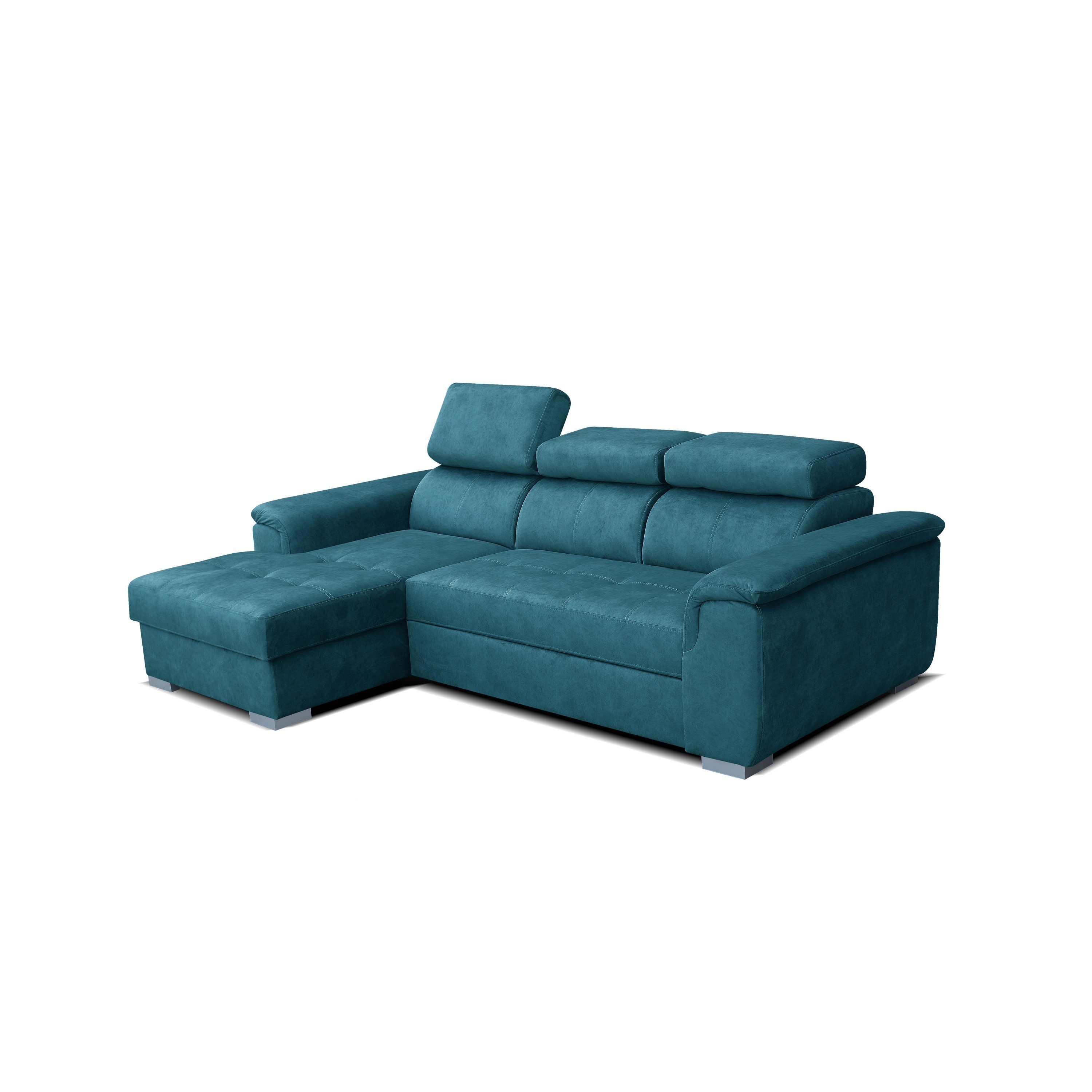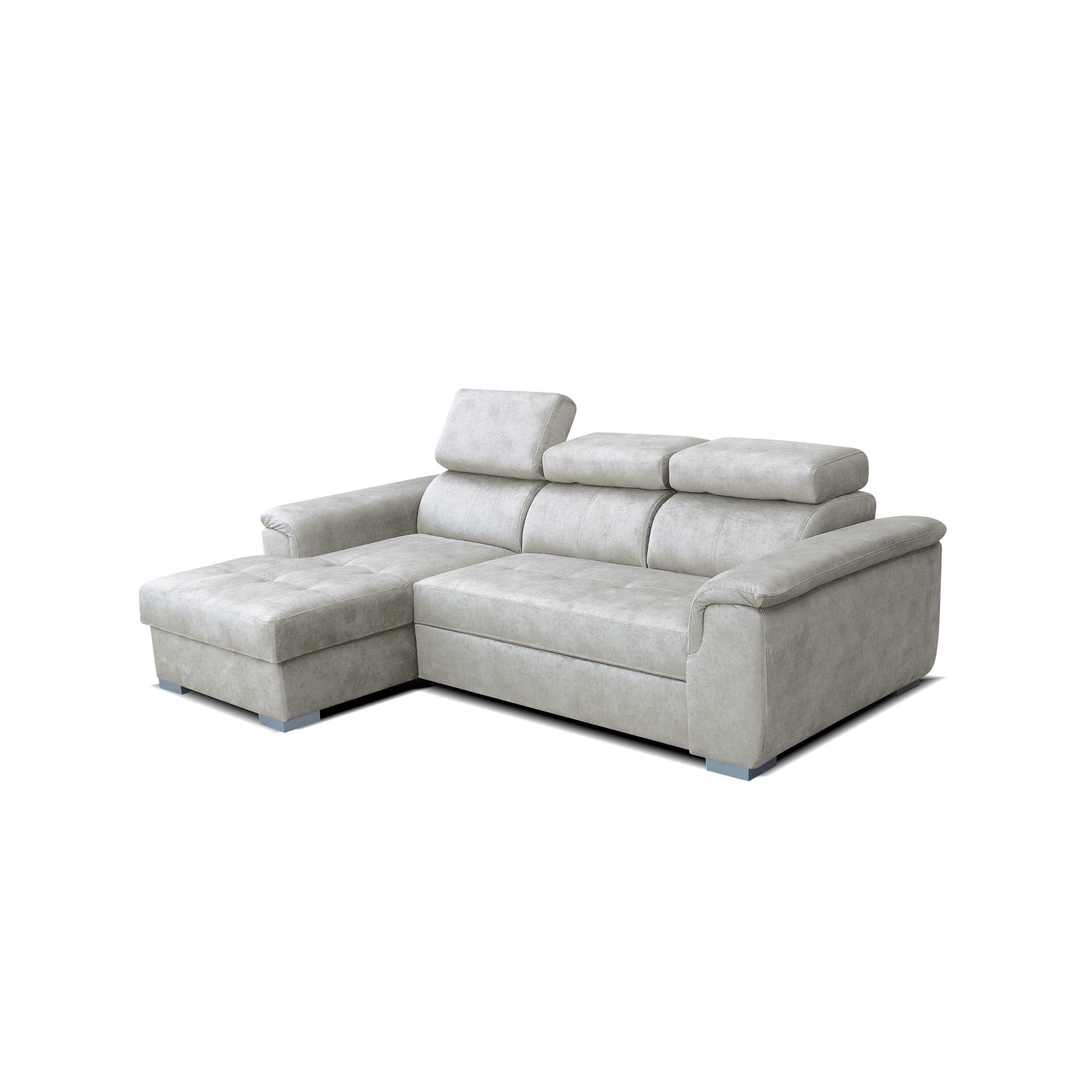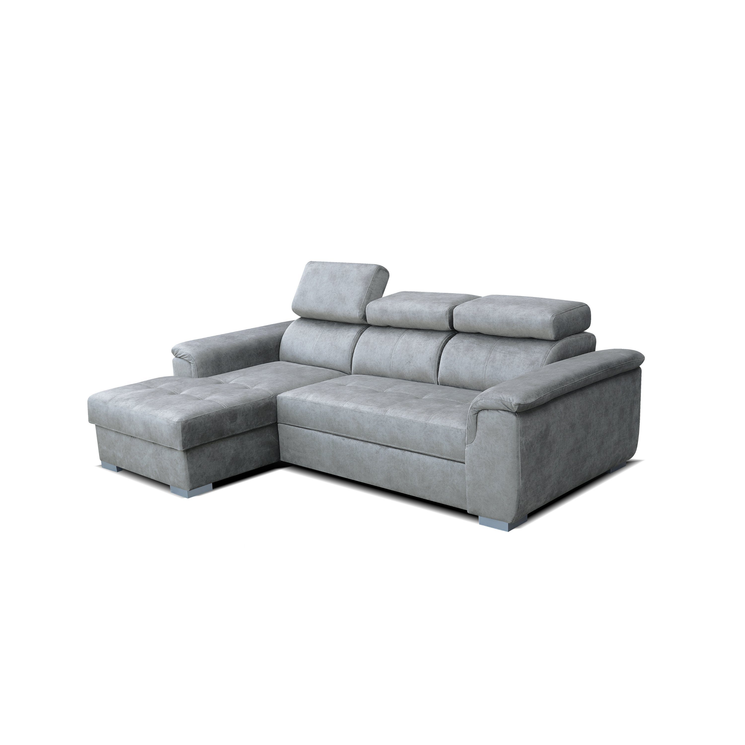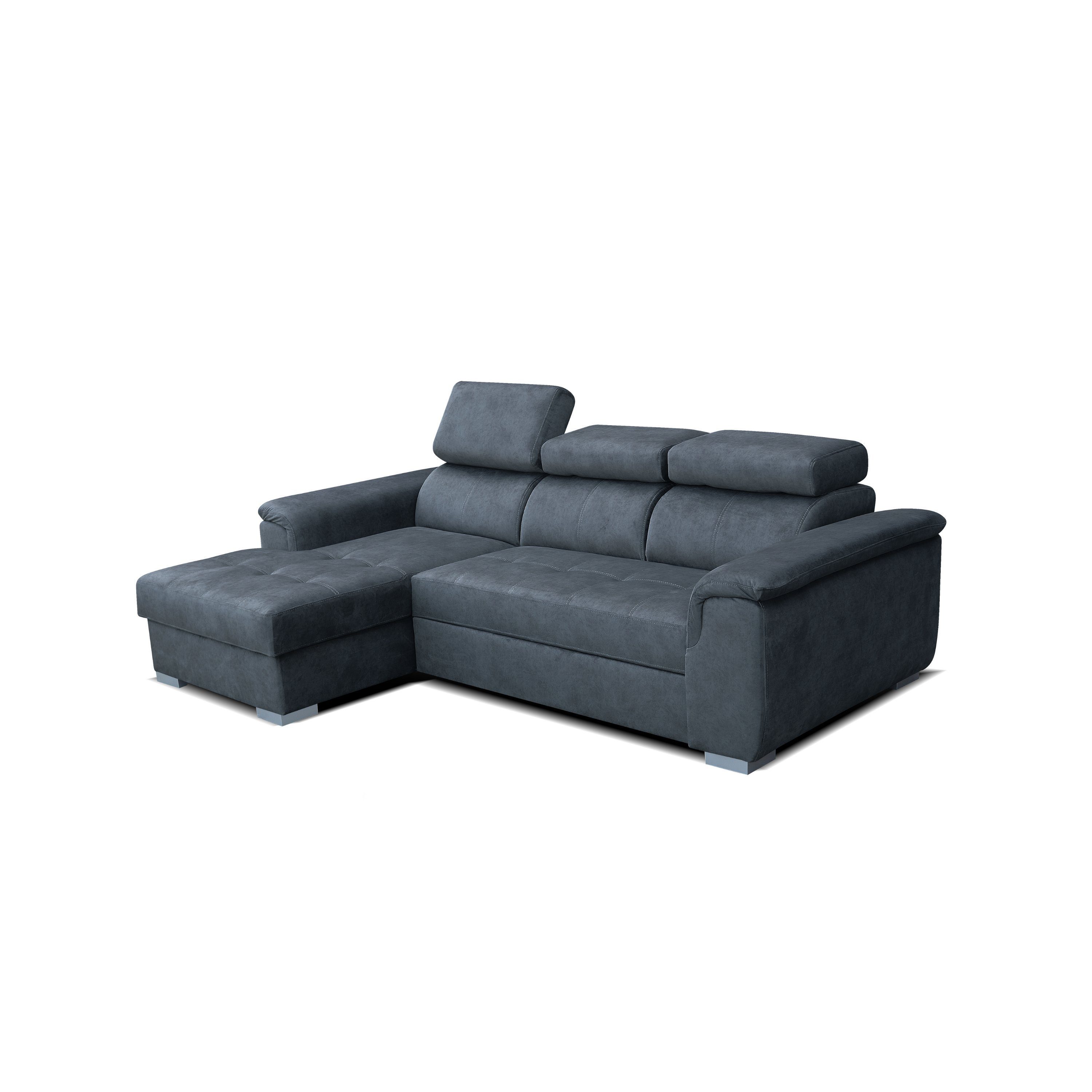 Entdecken Sie das moderne Robin Silver Ecksofa mit Schlaffunktion und Bettkasten – ein echter Platzsparer für Ihr Zuhause. Dieses in der EU gefertigte L-Form-Sofa, ideal positioniert in Ecken oder Raummitte, bietet dank 3 verstellbaren Kopfstützen ultimativen Komfort. Verwandelbar in ein Schlafbett (190x125 cm) mit DELFIN Ausklappmechanismus, eignet es sich perfekt für Gäste. Hochelastischer Schaum, Wellenfeder und stilvolles Design sorgen für Luxus und Eleganz. Abmessungen: L247 x B165 x H84 cm. Individualisieren Sie Ihre Wohnlandschaft mit unserer farblichen Auswahl. Langlebig, fleckenresistent und nachhaltig – das Ecksofa setzt Maßstäbe in Design und Qualität.