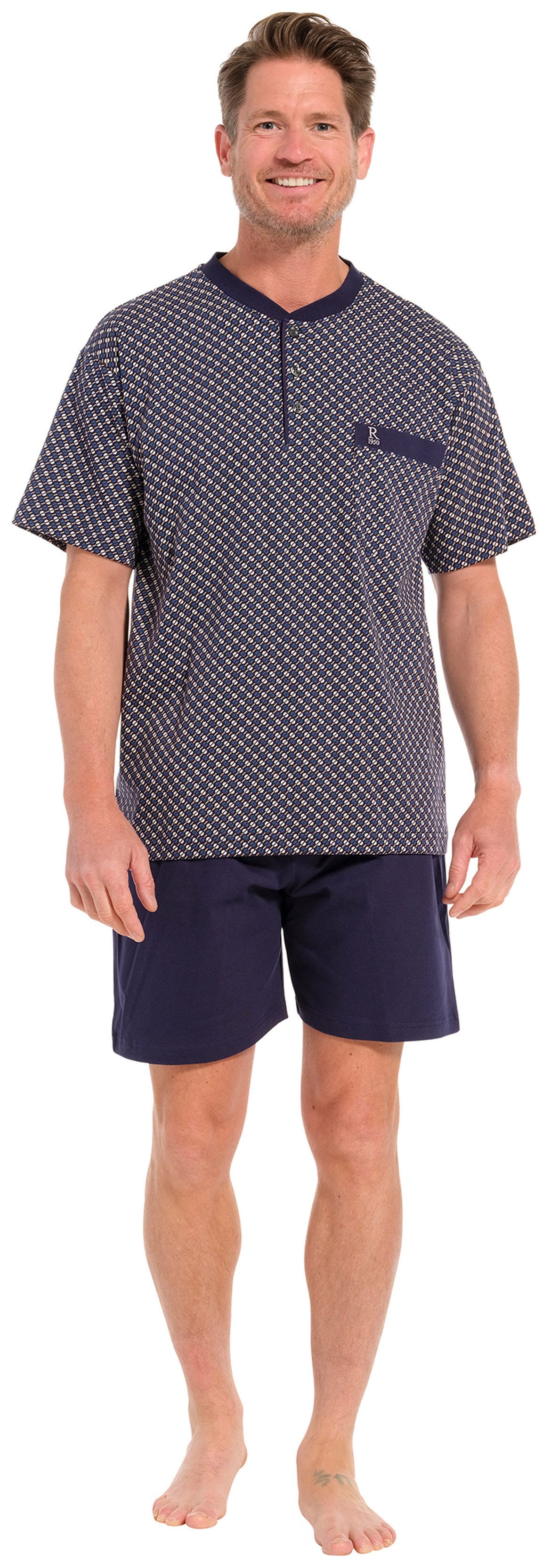 Dieser Robson Herren-Schlafanzug vereint Komfort und Funktionalität mit einem Hauch von Stil. Das Oberteil ist mit kurzen Ärmeln ausgestattet und verfügt über einen klassischen Rundhalsausschnitt, der eine bequeme Passform bietet und gleichzeitig einen zeitlosen Look verleiht. Eine praktische Knopfleiste entlang der Vorderseite des Oberteils ermöglicht ein einfaches An- und Ausziehen. Das Oberteil ist mit einer Brusttasche auf der linken Seite ausgestattet. Hergestellt aus hochwertiger 100% Baumwolle bietet dieser Schlafanzug ein weiches und angenehmes Tragegefühl. Die natürliche Atmungsaktivität der Baumwolle sorgt dafür, dass die Haut während des Schlafens kühl und trocken bleibt. Insgesamt ist dieser Herren-Schlafanzug eine perfekte Wahl für Männer, die sich in ihrer Nachtwäsche wohl und stilvoll fühlen möchten. Ob für gemütliche Nächte zu Hause oder für entspannte Wochenendmorgen, dieser Schlafanzug bietet den optimalen Mix aus Komfort, Funktionalität und Style.
