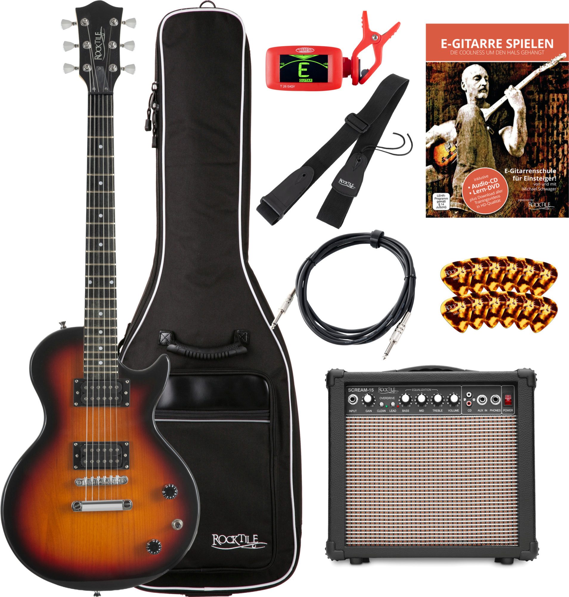 Dank dem flachen Korpus - Single Cut Modelle sind meist gewölbt - und dem schlanken Hals ist die L-100 auch für absolute Anfänger geeignet und mit 3,5 kg Gewicht verhältnismäßig leicht. Die Verarbeitung ist voll im grünen Bereich und auch soundtechnisch lässt die L-100 nichts anbrennen. Wenn Du eine richtig günstige E-Gitarre mit amtlichem Sound und toller Optik suchst aber keine Lust hast auf Lebensmittel-Discounter-Qualität, dann ist die Rocktile L-100 genau dein Ding!