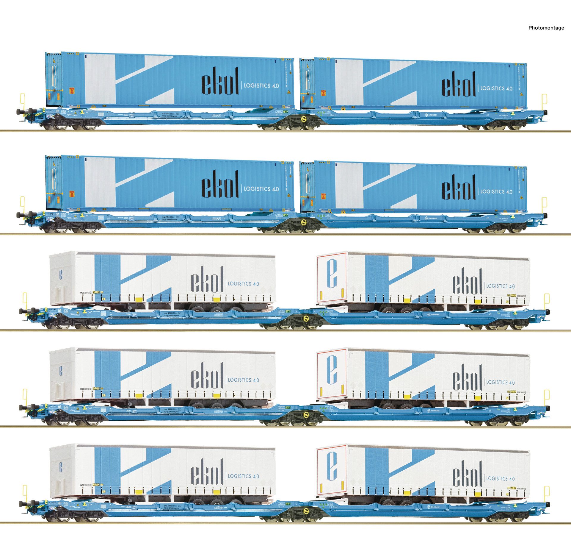 Display bestehend aus fünf Doppeltaschen-Gelenkwagen T3000e der EUROWAGON