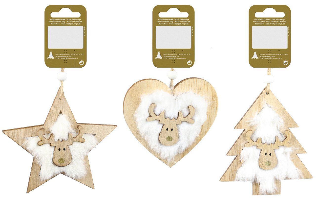 Dekohänger Weihnachten mit Fell Holz 10 cm natur-weiß 3-fach sortiert