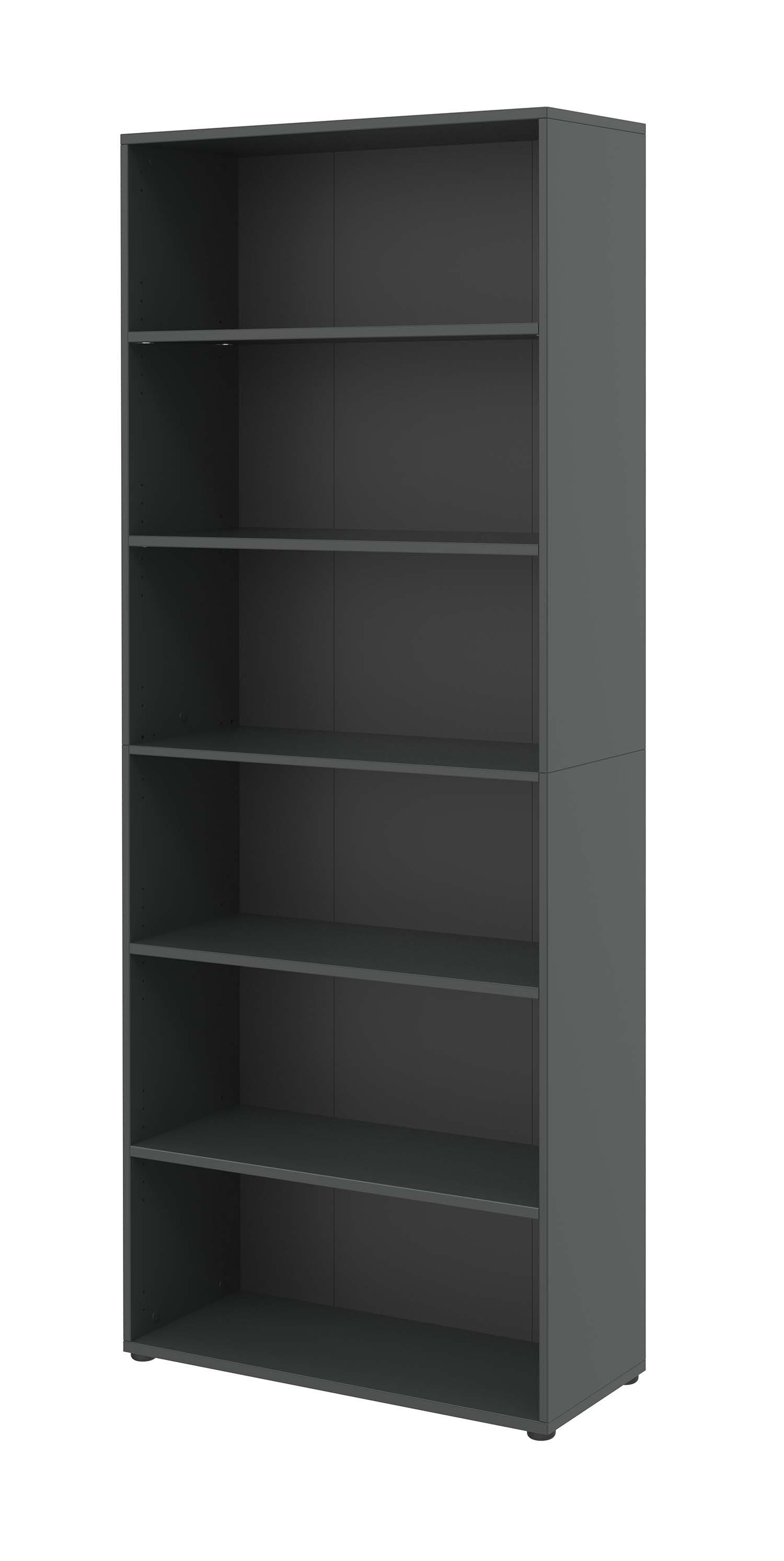 Das 80cm breite Regal mit anthrazitfarbenem Korpus hat eine Einteilung für sechs Fächer in Ordnerhöhe und -tiefe. Die Oberflächen sind pflegeleicht und strapazierfähig. Die verarbeiteten 19 mm starken Einlegeböden sind 3-fach höhenverstellbar und passen sich damit flexibel an individuelle Anforderungen an. Die robusten Kunststofffüße des vielseitig nutzbaren Ablageregals gewährleisten eine hohe Standfestigkeit.
