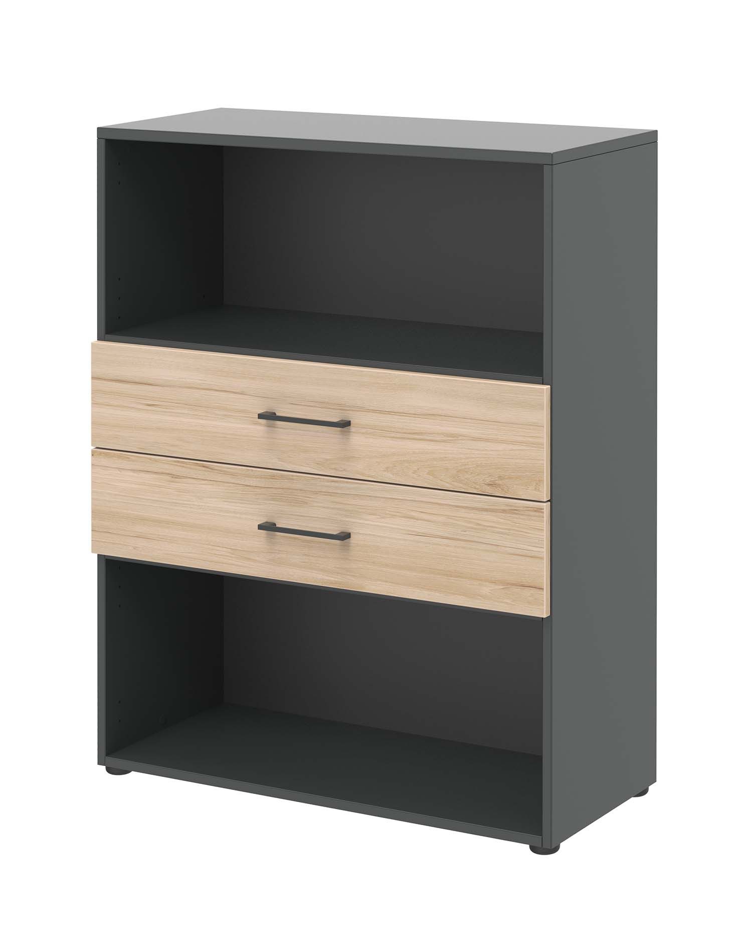 Das 80cm breite Regal oder TV-Sideboard mit anthrazitfarbenem Korpus besitzt drei Fächer, die in Höhe und Tiefe abgestimmt sind auf Standard-Ordner, sowie eine frei montierbare Schubkasteneinheit aus zwei Schüben mit Fronten in gemasertem Hickory-Dekor. Die schmalen Bügelgriffe aus anthrazitfarben pulverbeschichtetem Metall runden den Look des Mehrzweckmoduls der Serie ab. Die Oberflächen sind pflegeleicht und strapazierfähig. Die robusten Kunststofffüße sorgen für Standfestigkeit. Das Regal kann als Einzelmöbel oder in Kombination verwendet werden, wobei der Lust am Kombinieren keine Grenzen gesetzt sind.