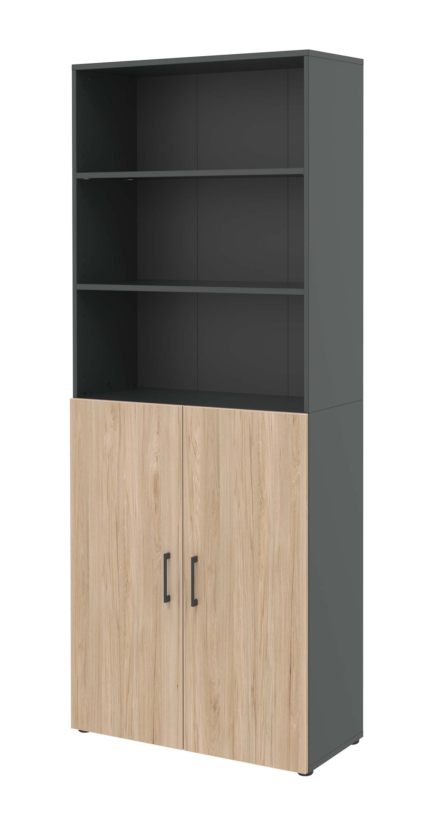 Der 212,5cm hohe Regalschrank mit zwei Türen und teilweise offenen Regalablagen bietet Platz für bis zu 6 Ordnerhöhen. Der Korpus ist anthrazitfarben, die Fronten kommen in einer warmen Hickoryholz-Optik. Die Türen lassen sich mit Hilfe anthrazitfarben pulverbeschichteter Metall-Bügelgriffe öffnen, die ebenso strapazierfähig und pflegeleicht sind wie die Oberflächen mit der ABS-Dickkante. Die stabilen, 19 mm starken Einlegeböden sind komfortabel 2-fach höhenverstellbar. Die großen, robusten Kunststofffüße sorgen für eine hohe Standfestigkeit. Der 80cm breite und 33,5cm tiefe Schrank ist einzeln oder in Kombination einsetzbar.