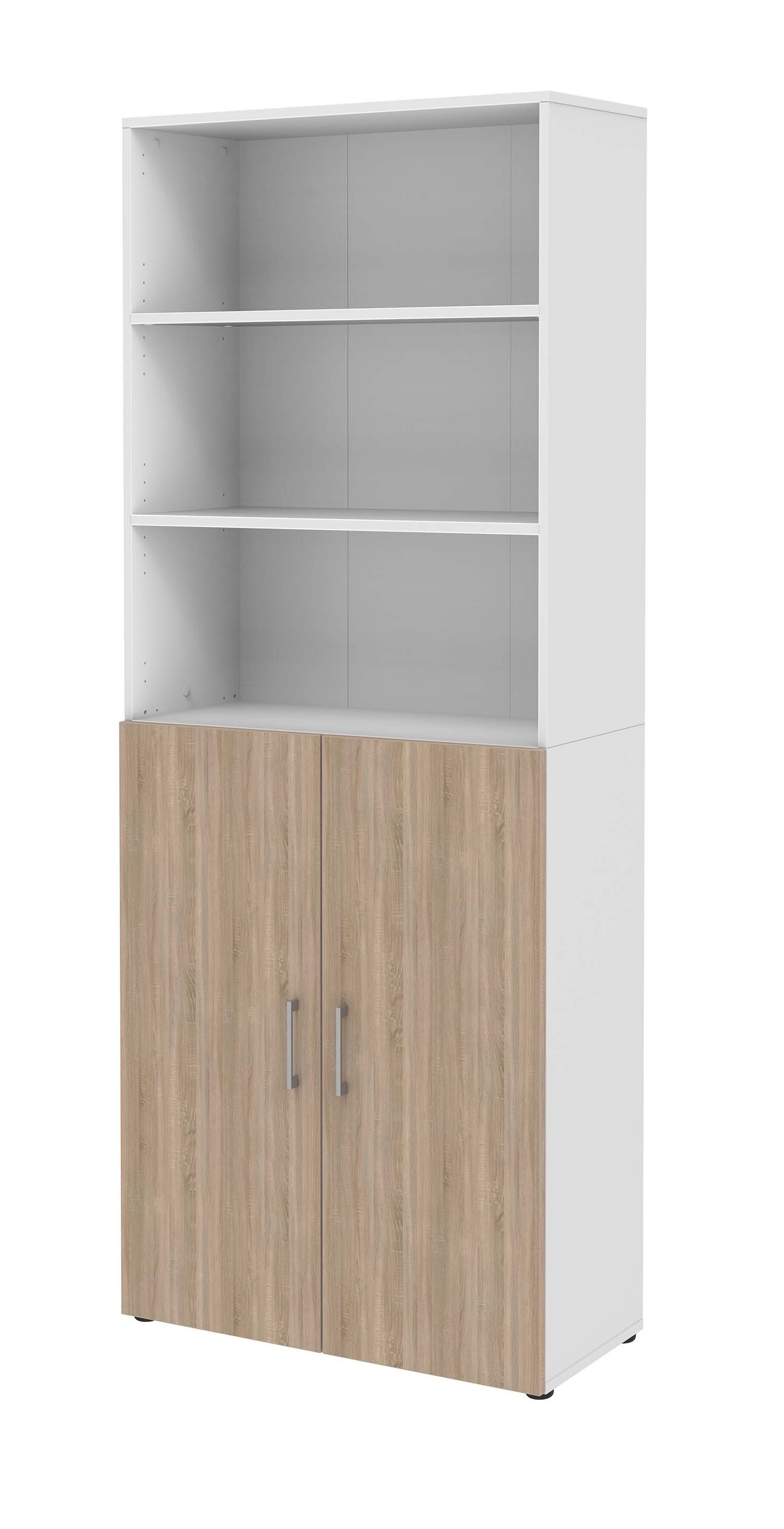 Der 212,5cm hohe Regalschrank mit zwei Türen und teilweise offenen Regalablagen bietet Platz für bis zu 6 Ordnerhöhen. Der Korpus ist weiß, die Fronten kommen in Sonoma Eiche-Optik. Die Türen lassen sich mit Hilfe alufarben pulverbeschichteter Metall-Bügelgriffe öffnen, die ebenso strapazierfähig und pflegeleicht sind wie die Oberflächen mit der ABS-Dickkante. Die stabilen, 19 mm starken Einlegeböden sind komfortabel 2-fach höhenverstellbar. Die großen, robusten Kunststofffüße sorgen für eine hohe Standfestigkeit. Der 80cm breite und 33,5cm tiefe Schrank ist einzeln oder in Kombination einsetzbar.