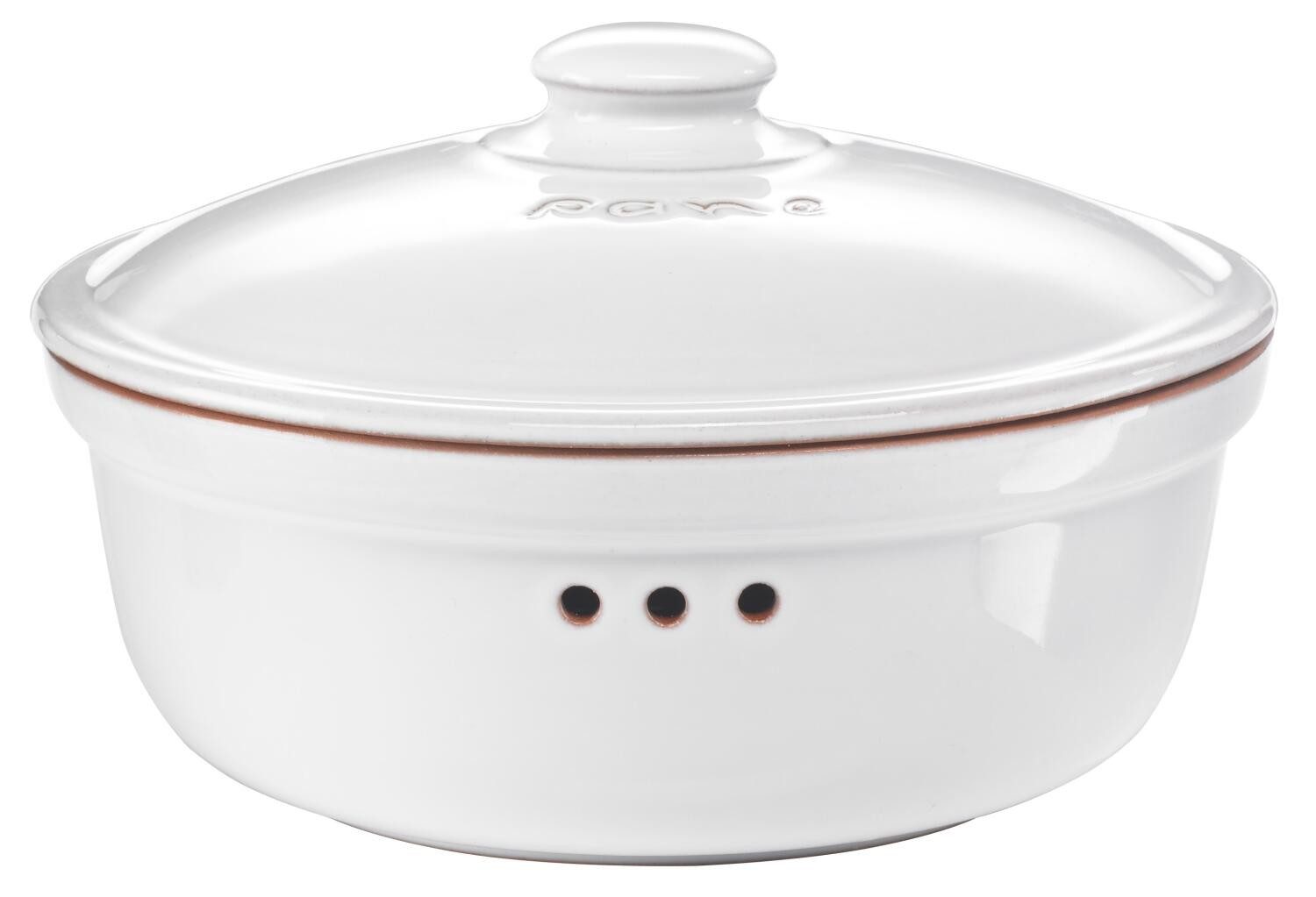 Aufbewahrung von Brot in einem Römertopf Brot-Frischetopf aus weißem Naturton. Mit atmungsaktivem Material und Luftlöchern für Frische und Knusprigkeit. Maße: Ø 30 cm, H 18 cm, rund. Ideal für ein länger frisches und appetitliches Brot. Spülmaschinenfest und mit poröser Innenglasur. Hergestellt in Europa.