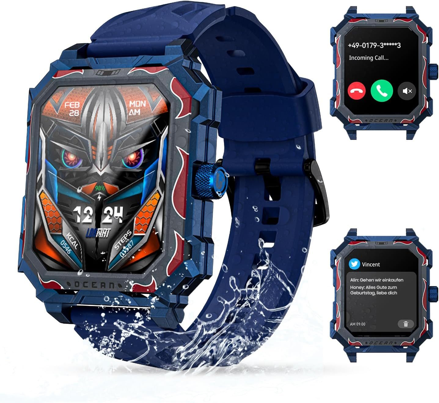Mit 123 Trainingsmodi zeichnet die Uhr Schritte, Distanz, Kalorien und Herzfrequenz auf. Sie ist nach IP69K wasserdicht und eignet sich für Outdoor-Sport, Regen und Schwimmen.