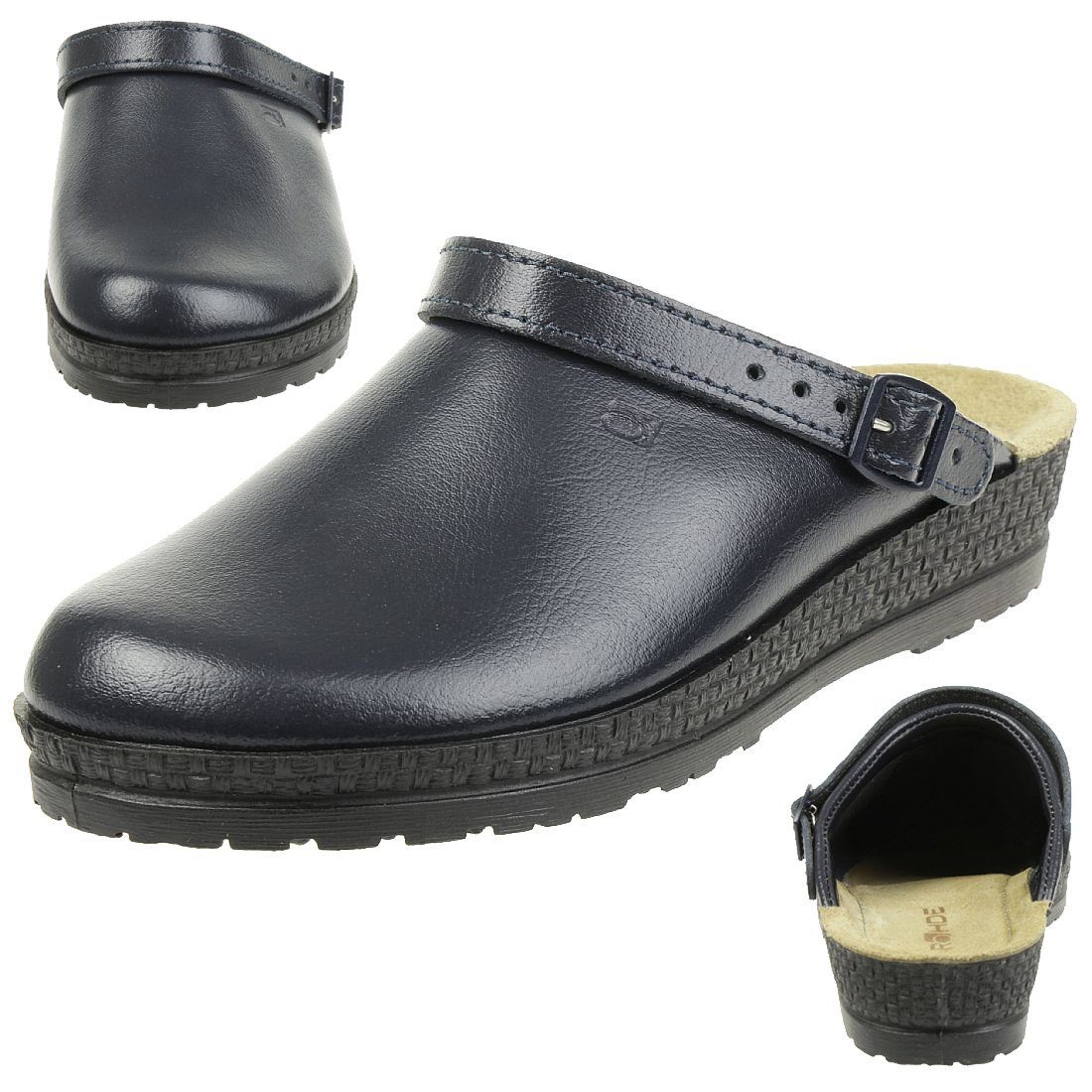 Klassische Damen Clogs Neustadt D von Rohde aus Leder in der Comfortweite G, mit anatomisch geformten weichem Fußbett und einem Riemen mit Schnalle zum Verstellen.