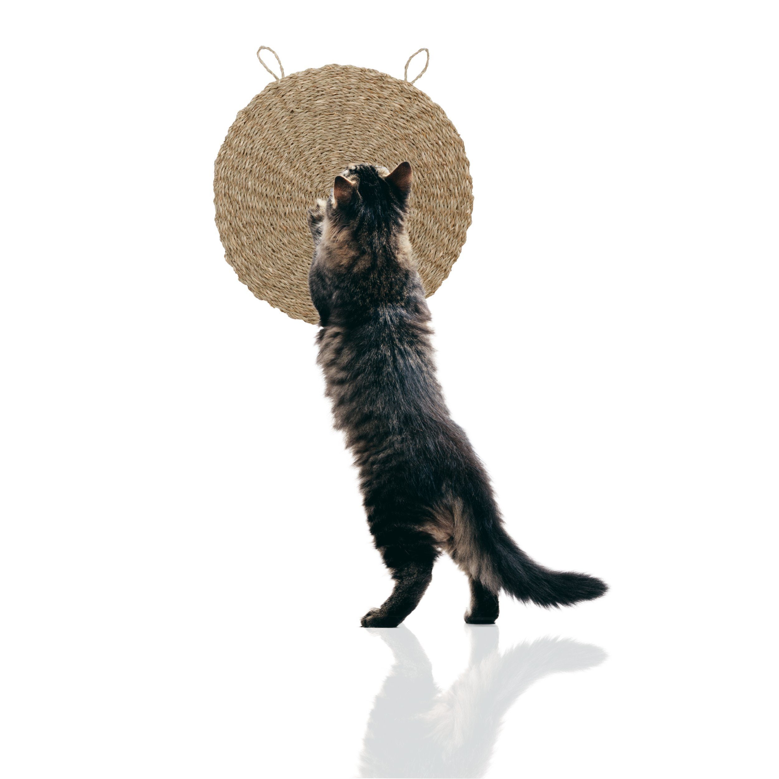 Schütze deine Möbel und tu deiner Katze etwas Gutes mit den handgeflochtenen Rohrschneider Kratzbretter Katze aus nachhaltigem Seegras. Katzen lieben es zu kratzen – und genau hier kommt unser Kratzbrett Katze ins Spiel. Es lenkt die Aufmerksamkeit deiner Samtpfote weg von Sofa, Teppich oder anderen geliebten Möbeln und bietet eine perfekte Alternative, die sowohl funktional als auch umweltfreundlich ist. Hergestellt aus schnellwachsendem, biologisch abbaubarem Seegras, steht unsere Kratzmatte Katze Wand für Эко-товары und Umweltfreundlichkeit. Der schonende Anbau und die umweltfreundliche Ernte machen sie zur idealen Wahl für verantwortungsbewusste Katzenbesitzer. Jede Kratzmatte wird in liebevoller Handarbeit gefertigt und ist dadurch ein echtes Unikat – hochwertig verarbeitet, langlebig und perfekt auf die Bedürfnisse deiner Katze abgestimmt. Die vielseitigen Verwendungsmöglichkeiten machen das Kratzbrett Wand besonders praktisch: Dank der zwei Aufhänger kannst du das Katzenzubehör einfach an der Wand befestigen oder auch auf den Boden legen und dich damit den Bedürfnissen deiner Katze anpassen. Dank der durchdachten Konstruktion des Kratzteppich Katze verzichten wir bewusst auf Aufkleber, sodass keine Kleberückstände an Wänden oder Möbeln zurückbleiben. Neben dem Schutz deiner Einrichtung unterstützt der Sisalteppich die Gesundheit deiner Katze. Das Kratzen pflegt die Krallen, stärkt und dehnt die Muskulatur in Pfoten, Beinen und Rücken und hilft dabei, Stress und Frustration abzubauen. Hol dir den nachhaltigen Rohrschneider Kratzteppich einzeln oder im 2er Set und schaffe die perfekte Kratzlösung für deine Katze!