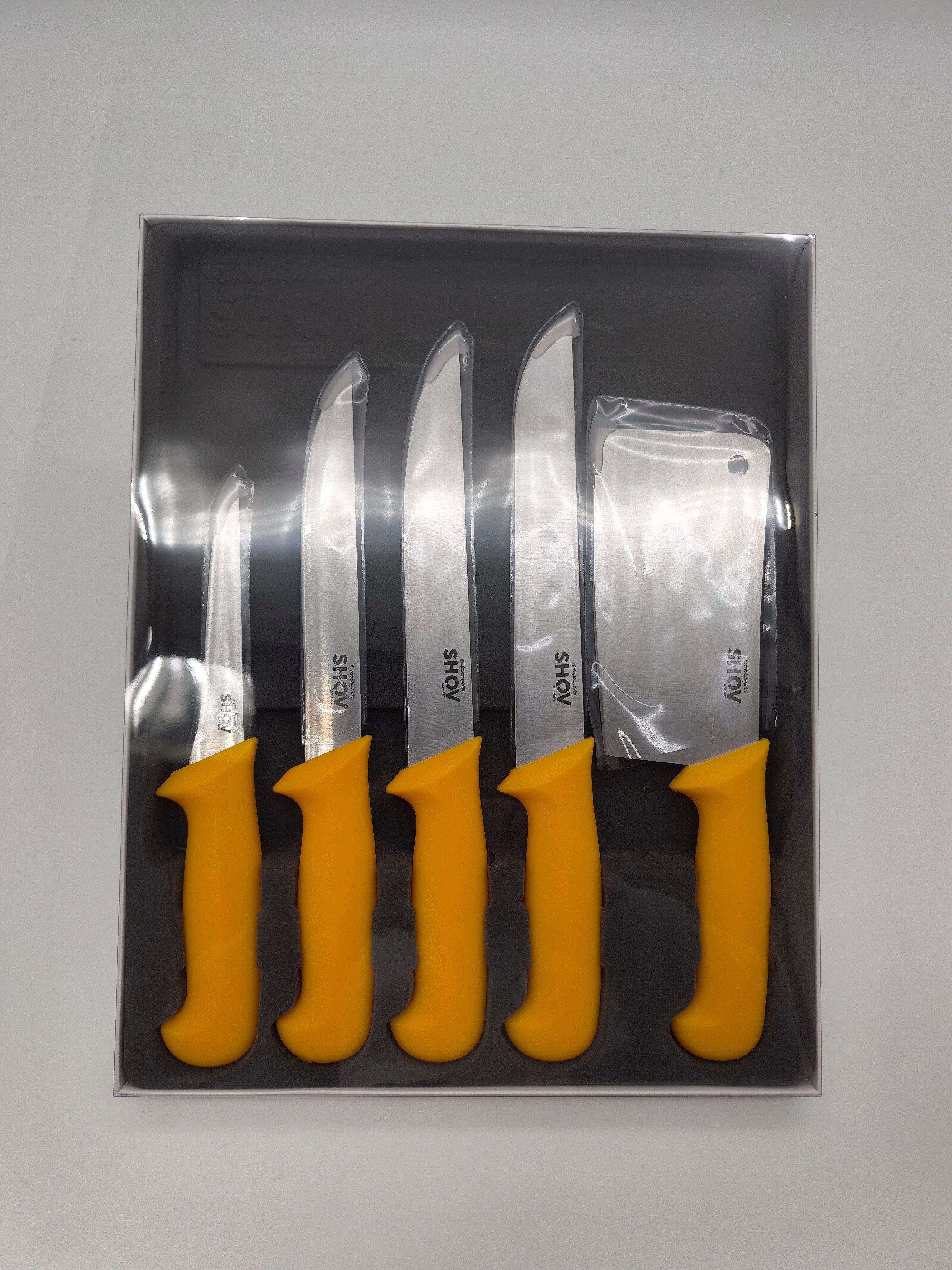 Das Shov Metzgermesser Küchenmesser Set bietet eine Auswahl an hochwertigen Messern für den professionellen Einsatz in der Küche. Das 5-teilige Set beinhaltet Schlachtmesser, Ausbeinmesser, Filetier- und Spickmesser, Gemüsemesser und ein Messerset mit einer Klingenlänge von 22 cm. Hergestellt aus Edelstahl und mit einem geraden Klingenrand ausgestattet, eignen sich die Messer für eine Vielzahl von Lebensmitteln wie Gemüse, Obst, Fleisch und mehr. Der Griff aus Kunststoff sorgt für eine sichere und komfortable Handhabung beim Schneiden und Zerkleinern. Ideal für den Einsatz in der Küche oder als Geschenk für Kochbegeisterte. Dieses Messerset von SHOV in Silberfarbe mit naturinspiriertem Muster ist ein unverzichtbares Werkzeug für Küchenprofis und Hobbyköche gleichermaßen. Mit einem vielseitigen Меню an Messern, darunter auch ein Schälmesser, Brötchenmesser und Hackmesser, ist das Set Shov Schlachtermesser Metzgermesser Fleischermesser Set in Profiqualität Edelstahl Rostfrei Ergo-Grip = aus speziell wiederstandsfähigem Kunststoff Handgearbeitet, - Profiqualität, hygienisch ergonomisch, 5 teilig 1x Hackbeil, 1x Fleischermesser 21 cm, 1x Stechmesser 20cm, 1x Stechmesser 18cm, 1x Ausbeinmesser 13cm 5 Teiliges Messerset SHOV mit Hackbeil
