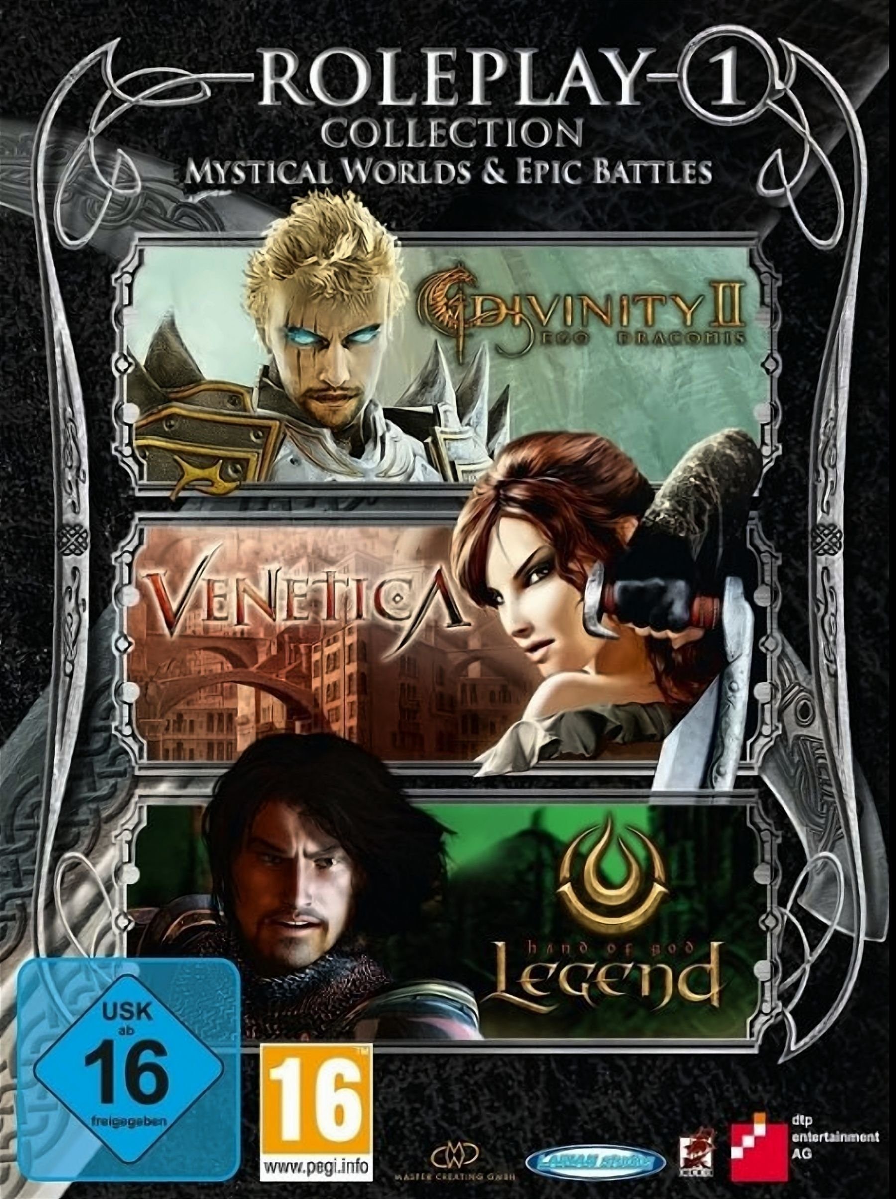 Spielbeschreibung | Stürze dich in drei fesselnde Rollenspielabenteuer um Drachen, Dämonen und Fantasygestalten.Divinity 2:Seit einer Reihe zerrüttender Kriege ist die Welt von Rivellon in zwei Lager gespalten. Ein junger Held steht vor der Entscheidung seines Schicksalsweges und findet sich zwischen den Fronten der verfeindeten Fraktionen der Drachenritter und -jäger wieder. Von nun an führt er ein Leben als Gestaltenwechsler und entwickelt bald ungeahnte Kräfte.Venetica:Bei einem Überfall entgeht die junge Scarlett nur knapp einem Mordanschlag und verliert dabei ihren Geliebten. Kurz drauf erscheint ihr der leibhaftige Tod, der sich als ihr Vater zu erkennnen gibt. Dieser schickt sie nach Venedig, um Rache zu üben und fünf böse Fürsten zu bezwingen. Nun liegt es an ihr, das Gleichgewicht der Welt der Lebenden wiederherzustellen.Legend:Die Aufnahme eines jungen Adepten in die heilige Bruderschaft wird jäh durch einen Zwischenfall am von ihnen bewachten Portal erschüttert. Durch das Tor strömen finstere Dämonen, die den Orden vernichten und das Land verwüsten. Nur mit Hilfe eines mächtigen Artefakts kann das Böse gebannt und das Portal entgültig versiegelt werden. Die Suche beginnt!Sprache/Untertitel: DeutschHandbuch: Deutsch Plattform: Windows XP / Vista / 7 |