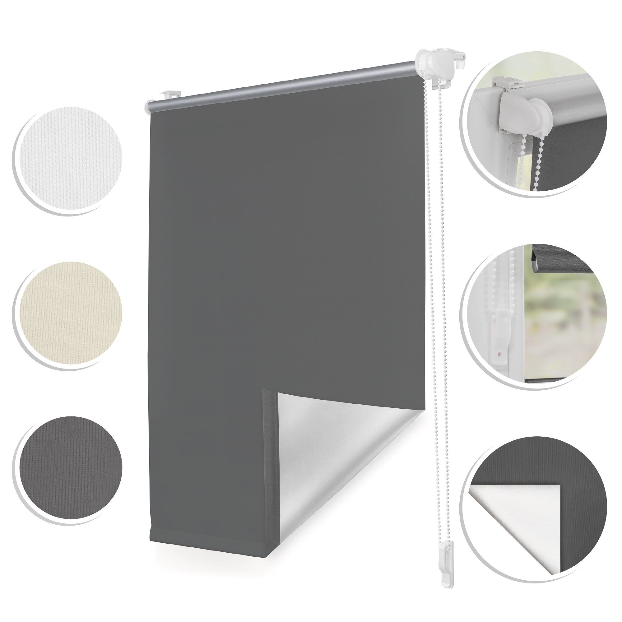 Lieferumfang | Seitenzugrollo, Montageanleitung, Zugschnur, 2 x Klemmträger, Montagezubehör für Wand & Decke |