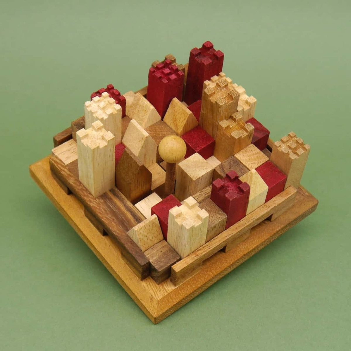 Das BURGPUZZLE von ROMBOL Denkspiele ist ein faszinierendes Legepuzzle, das die perfekte Mischung aus Geduldsspiel und Packingpuzzle bietet. Auf einer quadratischen Grundplatte sollen 9 unterschiedliche Häuser- und Turmgruppen so angeordnet werden, dass ein harmonisches und ansprechendes Gesamtbild einer Burglandschaft entsteht. Dabei bleibt stets ein Feld frei, auf dem ein Baum platziert wird, der das Bild vervollständigt und für ein malerisches Landschaftsbild sorgt. Die besondere Herausforderung des BURGPUZZLE liegt in der Vielzahl an Kombinationsmöglichkeiten: Es gibt 13 verschiedene Positionen für den Baum, wodurch sich mindestens ebenso viele verschiedene Burgbilder ergeben. Doch die Kreativität kennt hier keine Grenzen – immer wieder entstehen neue, individuelle Burglandschaften. Dies macht das BURGPUZZLE zu einem Denkspiel, das sich auch nach mehrmaligem Spielen nicht erschöpft und immer wieder aufs Neue herausfordert. Gefertigt aus hochwertigem Holz, überzeugt das BURGPUZZLE nicht nur durch seine spielerischen Qualitäten, sondern auch durch seine ansprechende Optik und angenehme Haptik. Das langlebige Material macht es zu einer stilvollen Geschenkidee für Puzzle-Liebhaber, Freunde von Geduldsspielen und alle, die gerne knobeln. Ob alleine, zu zweit oder in der Gruppe – das BURGPUZZLE lädt zum gemeinsamen Tüfteln und Entspannen ein und fördert gleichzeitig Konzentration, Logik und räumliches Denken. Als anspruchsvolles Geduldsspiel vereint es die Faszination eines klassischen Packingpuzzles mit dem Charme einer mittelalterlichen Burglandschaft und eignet sich hervorragend als hochwertiges Geschenk aus Holz für Jung und Alt. Entdecke mit dem BURGPUZZLE von ROMBOL Denkspiele immer wieder neue Möglichkeiten und genieße stundenlangen Puzzlespaß!
