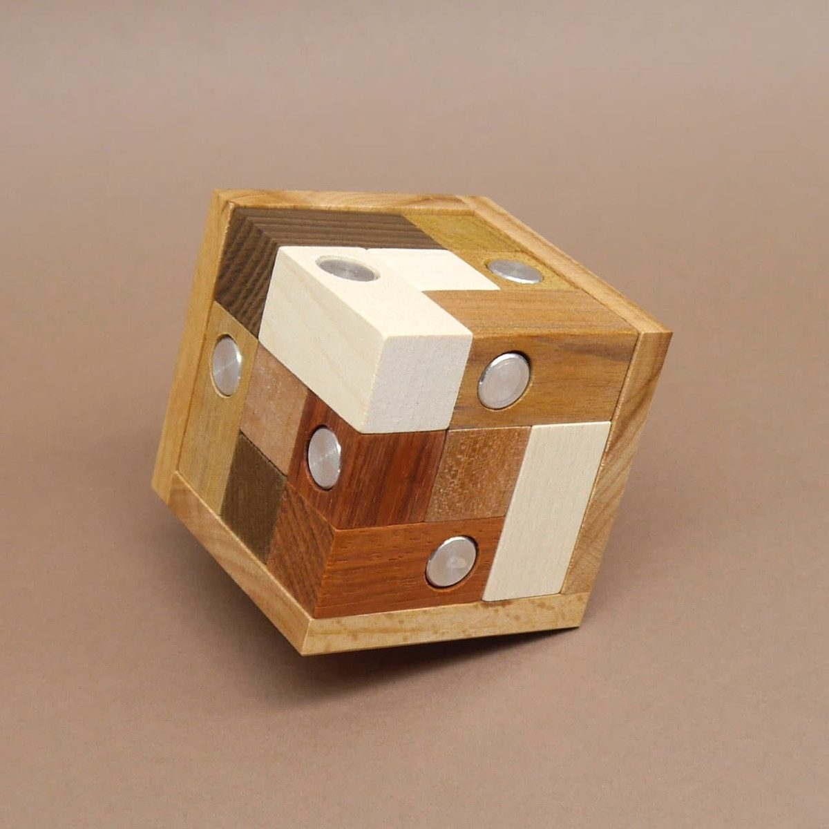 Der Metallwürfel von Jean Claude Constantin vereint anspruchsvolles Puzzle und elegantes Design. Holz und Metall fördern logisches Denken und Feinmotorik – ein echter Blickfang.