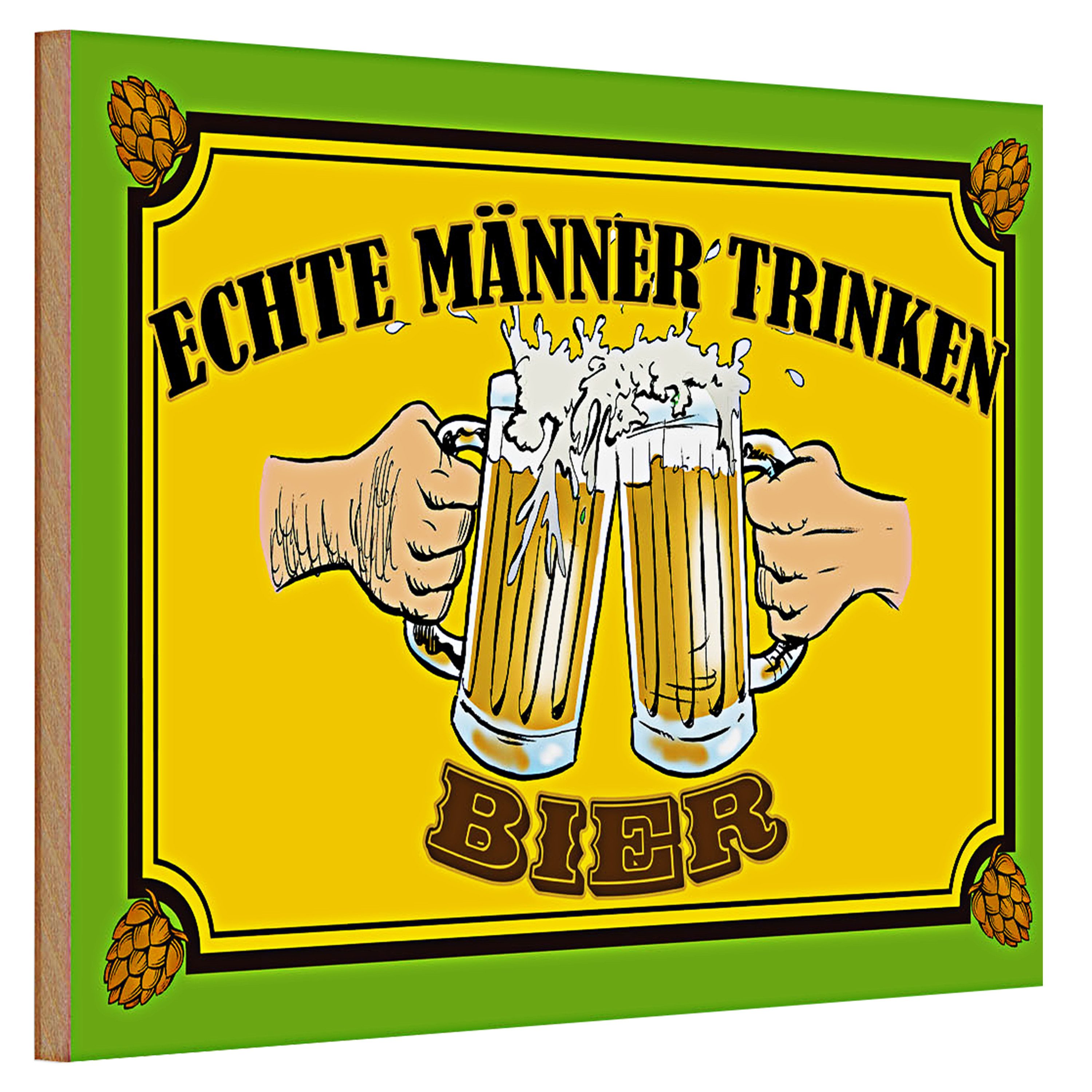 Dieses lebendige Holzschild verkörpert die unbeschwerte Freude eines gut gekühlten Bieres in geselliger Runde. Mit dem Spruch 'Echte Männer trinken Bier' und zwei kräftigen Händen, die volle Bierkrüge anstoßen, ist es ein Symbol für Kameradschaft und die kleinen Freuden des Lebens. Die leuchtenden Farben und das Retro-Design machen es zu einem Blickfang in jeder Bar, Küche oder Männerecke. Ideal für die Dekoration von Hausbars, Pubs oder als Geschenk für den Bierenthusiasten in Ihrem Leben. Dieses Schild bringt Humor und Charakter in jede Umgebung und spricht besonders Männer an, die das traditionelle Biertrinken schätzen.