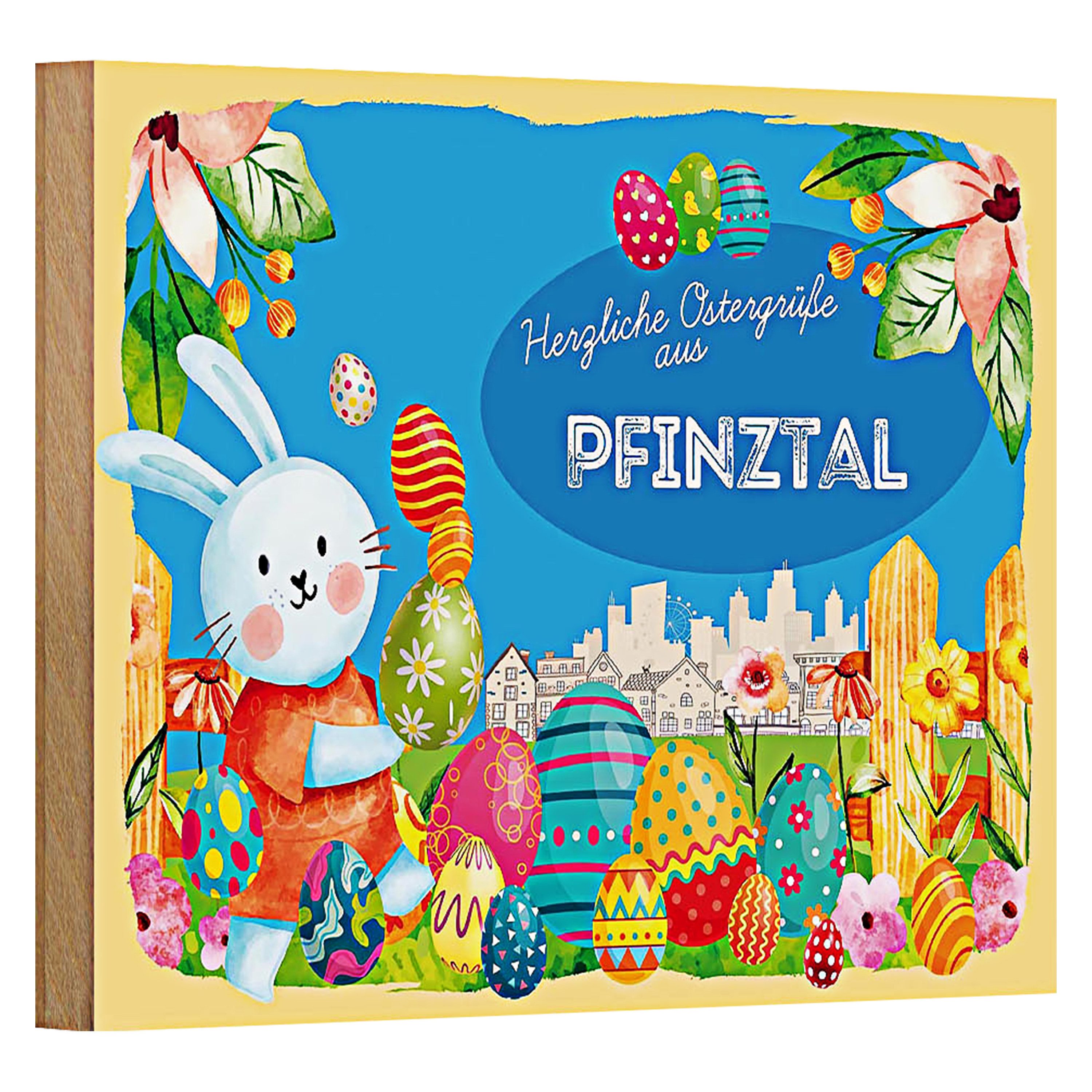 Tauchen Sie ein in die fröhliche Welt des Osterfestes mit dieser charmanten Holzpostkarte aus Pfinztal.
