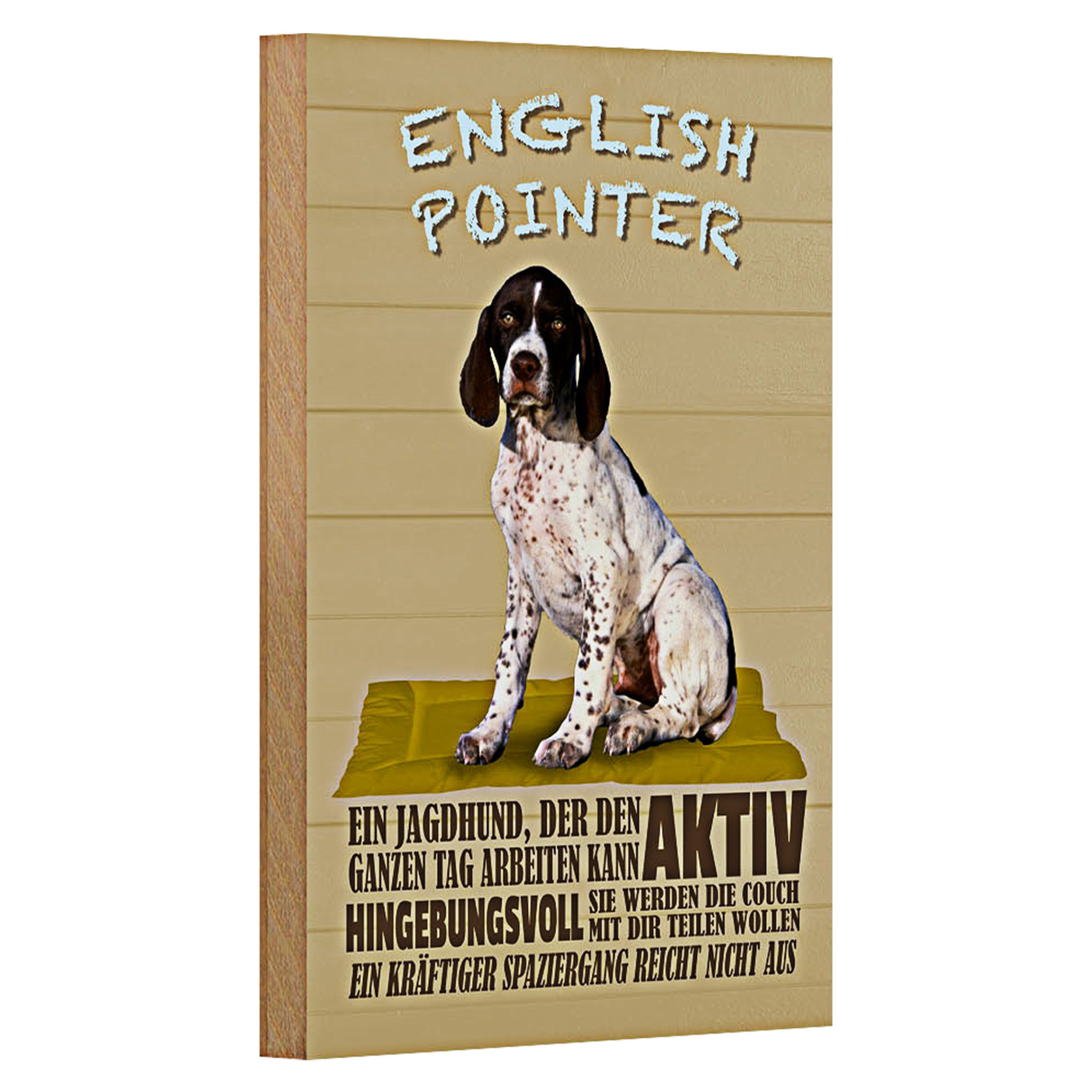 Dieses charmante Holzschild präsentiert stolz einen English Pointer, bekannt für seine Ausdauer und Energie.
