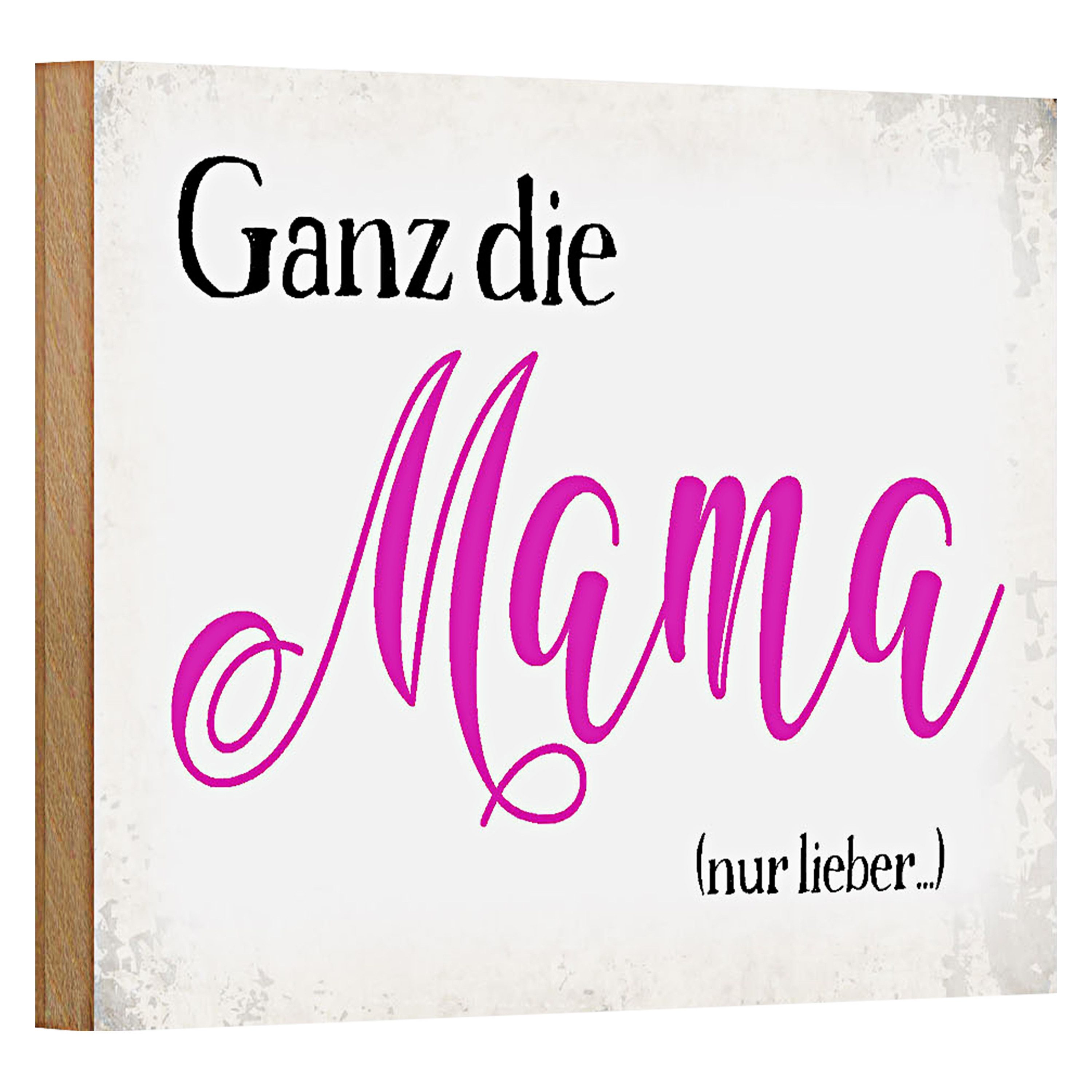 Ein charmantes Holzschild, das in lebendigen Pinktönen die Worte 'Ganz die Mama (nur lieber )' präsentiert.