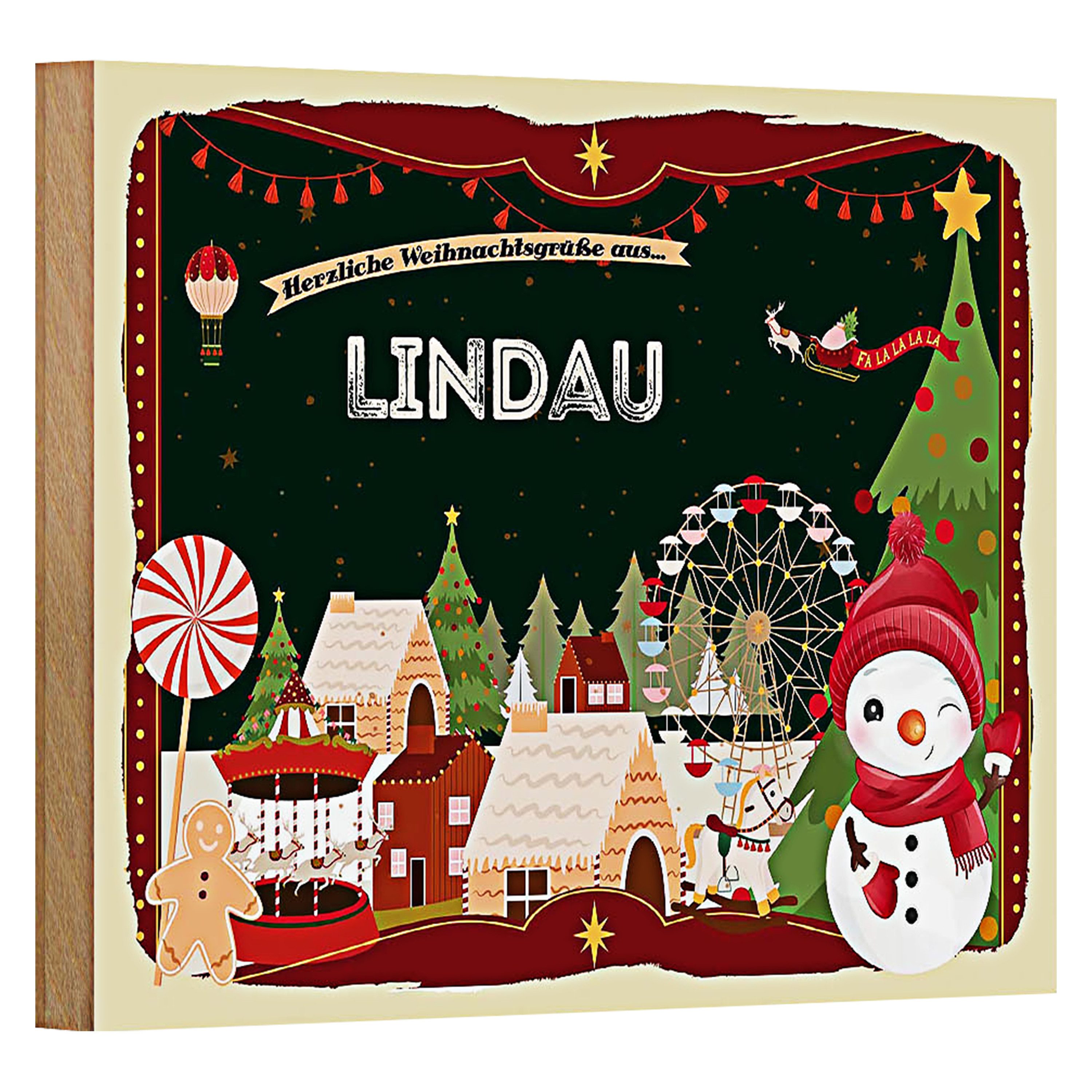 Tauchen Sie ein in die zauberhafte Weihnachtswelt von Lindau mit diesem nostalgischen Holzschild Ein charmantes Winterwunderland mit Schneemann, Riesenrad und festlichen Lichtern.