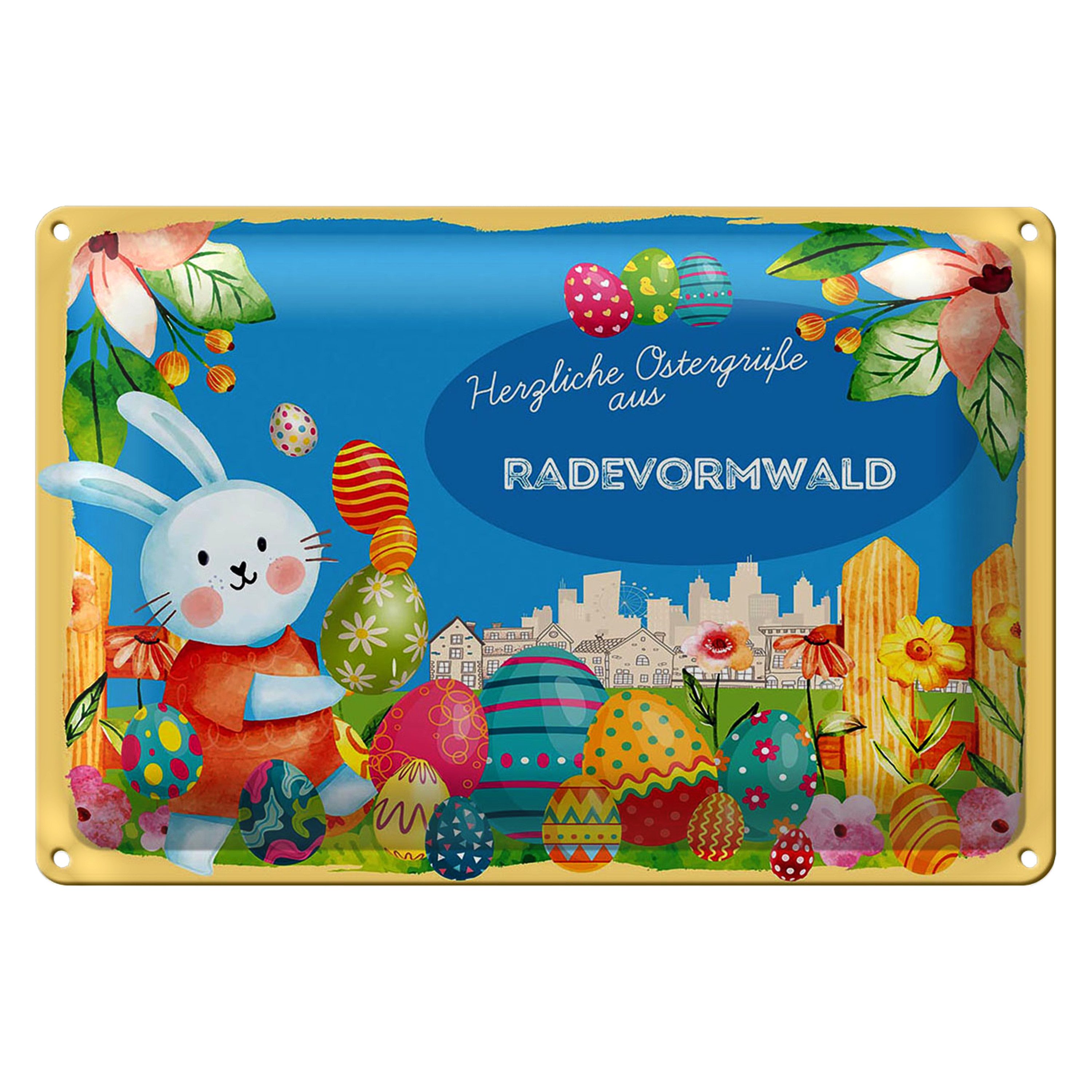 Dieses charmante Blechschild bringt die fröhliche Osterstimmung direkt zu Ihnen nach Hause. Mit einem niedlichen Hasen und bunten Ostereiern verziert, versprüht es den Charme von Radevormwald. Perfekt für die Osterdekoration, verleiht es jedem Raum eine festliche Atmosphäre. Die leuchtenden Farben und das verspielte Design machen es zu einem Hingucker, der Freude und Herzlichkeit ausstrahlt.Ideal für die Osterdekoration in Ihrem Zuhause oder als fröhliches Geschenk für Freunde und Familie. Bringt festliche Stimmung in jeden Raum.Schild aus qualitativ hochwertigem Stahlblech. Keine scharfkantigen Stellen dank rundum umgeschlagene Kanten. Abgerundete Ecken mit vorgebohrten Löchern für eine einfache Befestigung an Wänden, Türen, Zäunen usw.