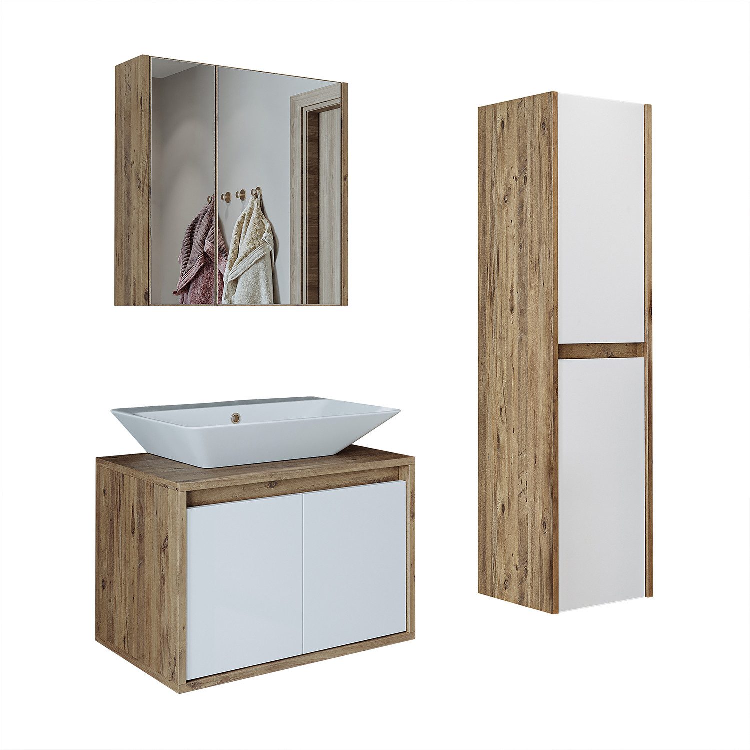 Unser Badmöbel Set verleiht Ihrem Badezimmer mit seinem modernen Design und harmonischen Farbkombinationen eine schöne Note. Hochwertiges Material, pflegeleichte Oberfläche und Soft-Close-Türen machen diese komfortable Badmöbelserie besonders attraktiv. 4-fach Hochschrank, 3-fach Spiegelschrank und 65 cm breiter Unterschrank mit Keramik Waschbecken bieten viel Stauraum.