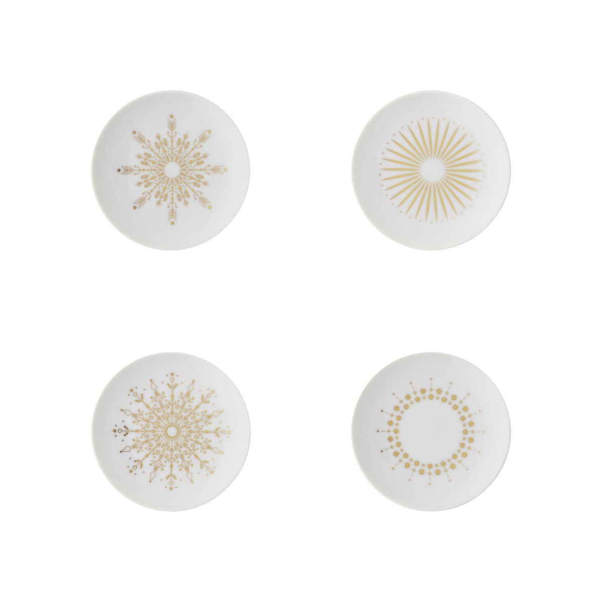 Das Rosenthal TAC Gropius Festive Celebration Stars Brotteller Set, bestehend aus 4 Tellern mit einem Durchmesser von 10 cm, strahlt festlichen Glanz aus. Die Teller sind mit einem eleganten Sternenmotiv verziert und verleihen jedem gedeckten Tisch eine magische Note. Ideal für Brot, Snacks oder Vorspeisen bei festlichen Anlässen.
