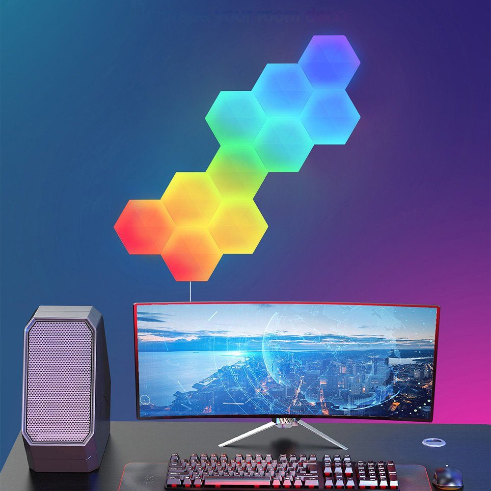 Lieferumfang | 10× LED Sechseckige Wandleuchte 1× Steuergerät 1× Fernbedienung (CR2025 Batterie nicht enthalten) 1× USB-Kabel 10× Doppelseitiges Klebeband 9× Verbindungsstück 1× Benutzerhandbuch |