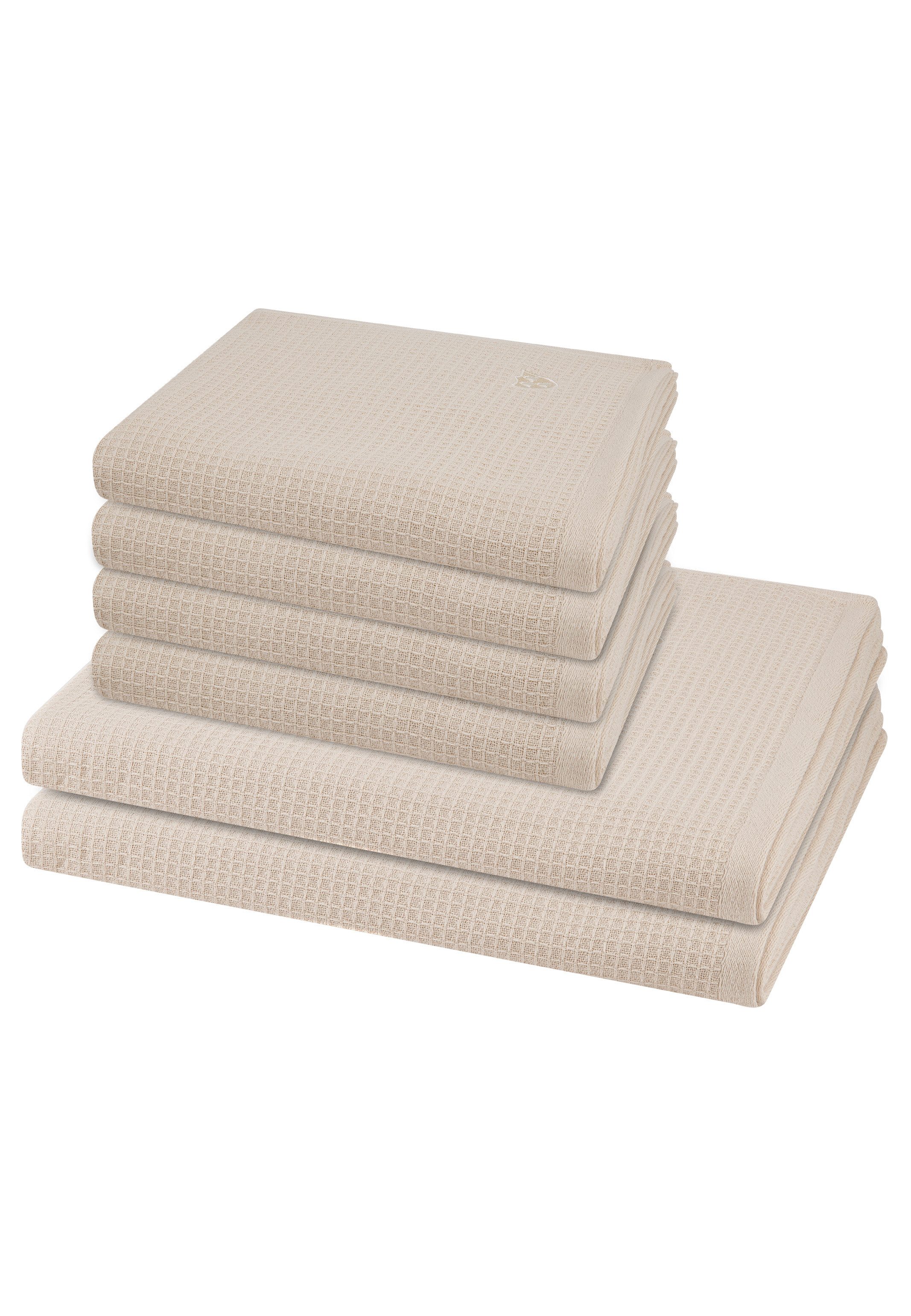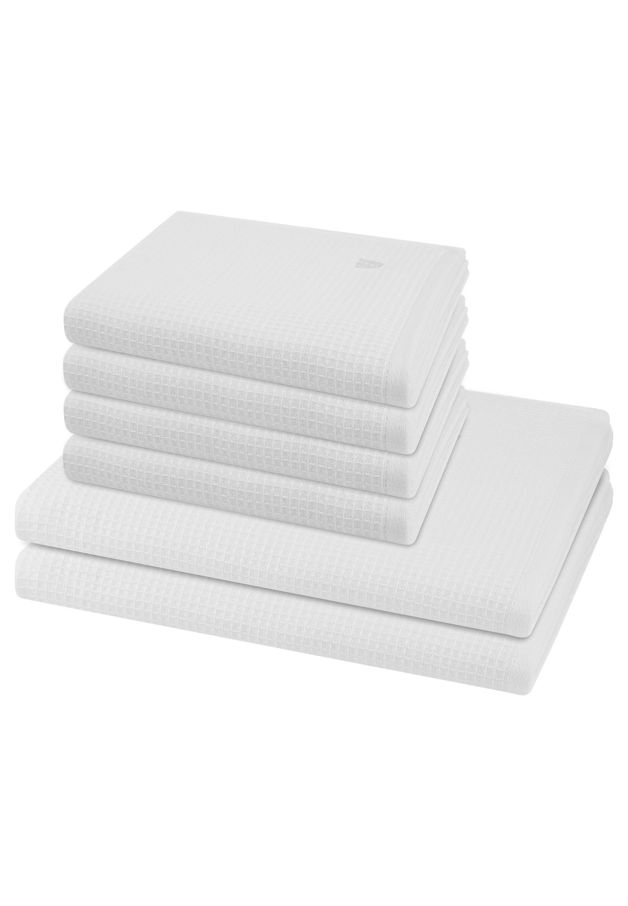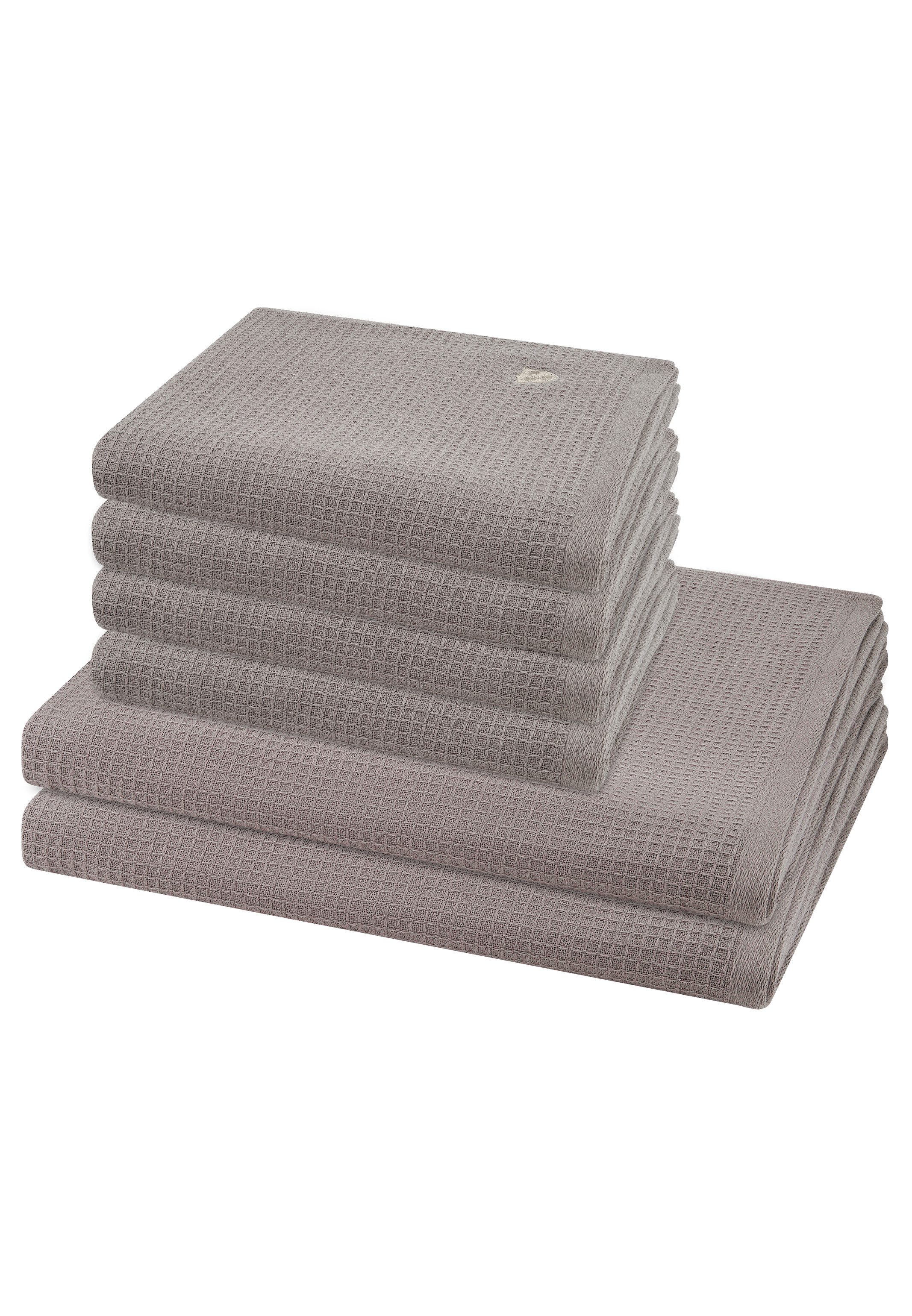 Diese Frottierserie kombiniert stilvolles Waffel-Piqué mit weichem Frottier und bietet reinen Baumwollkomfort. Mit 520 g/m² Flächengewicht überzeugt sie durch hohe Saugkraft und angenehme Haptik. Das edel gestickte Marken-Emblem und die gewebte Bordüre verleihen ein exklusives Design. Pflegeleicht, maschinenwaschbar und trocknergeeignet ist die Serie ideal für eine moderne Bad-Ausstattung. Set besteht aus: 4 X Handtuch (50 X 100cm), 2 X Duschtuch (70 X 140cm)