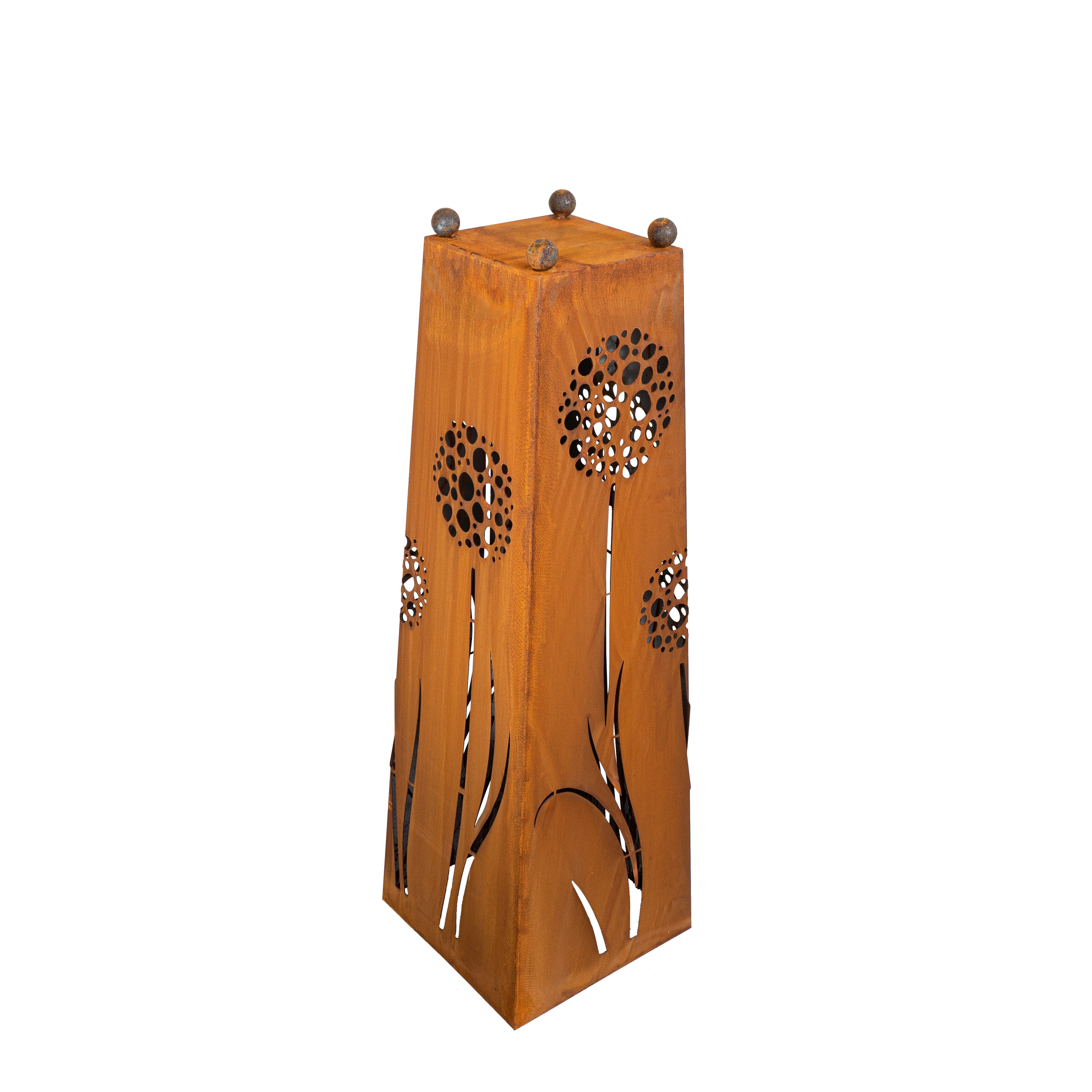 Die konische Pflanzsäule mit Pusteblumen-Motiv bringt sofort Höhe, Struktur und warmen Edelrost-Charme in Eingangsbereiche, auf Terrasse, Balkon oder ins Blumenbeet. Die Silhouette ist von allen Seiten sichtbar; die runde Bodenöffnung erlaubt – je nach Standort – sogar eine dezente Beleuchtung von innen.
