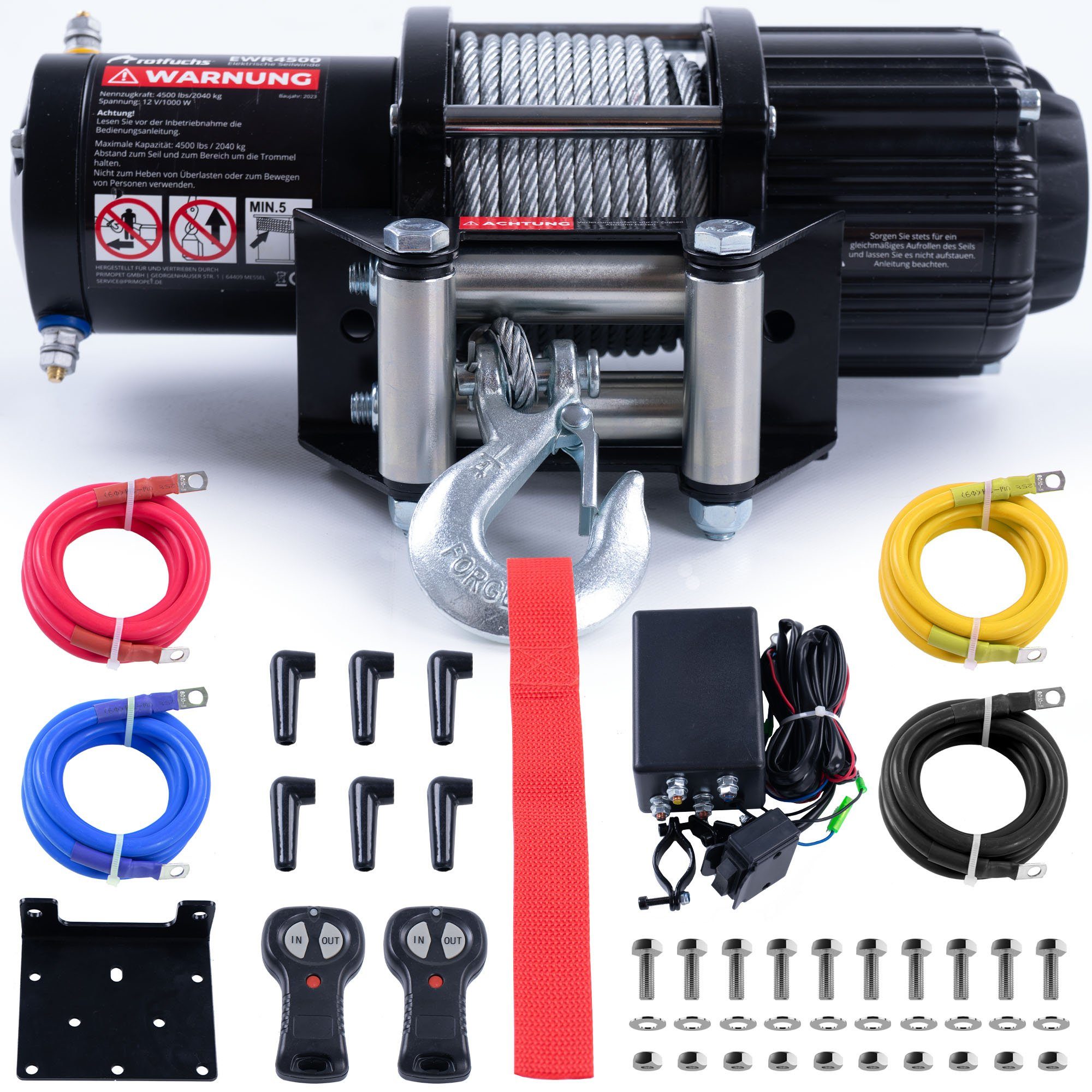Unsere robuste und langlebige Offroad-Seilwinde EWR4500 ist für den Einsatz in unwegsamen Gelände für Schwerlasten geeignet. Mit einer maximalen Zuglast von 2024 kg ist die Seilwinde für ATV, SUV, Trucks, kleine Anhänger und Wohnmobile verwendbar. Ein hochwertiges 15 Meter Seil sorgt für einen zuverlässigen Einsatz beim Ziehen und Ablassen von Fahrzeugen. Die Seilwinde ist wassergeschützt und verfügt über eine Freilauffunktion, sodass bei einer Verknotung das Seil per Hand abgerollt werden kann. Dank dem 1,3 PS starken Motor mit dreistufigen Planetengetriebe erreicht die Seilwinde eine max. Zuggeschwindigkeit von 8 m / min. Perfekt für Einsätzen im Offroad-Bereich geeignet.