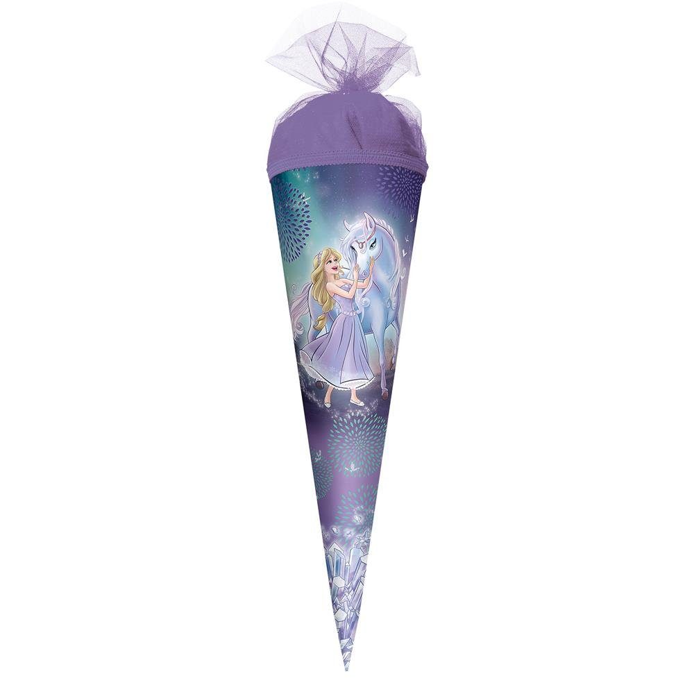 Eine hübsche Prinzessin und ihr wunderschönes weißes Pferd zieren diese Schultüte. Das lilafarbige Motiv wird mit zarten Details wie funkelden Eiskristallen und einem schönen Hintergrund ergänzt. Die Zuckertüte ist 50 cm groß, rund und mit lila Tüll verschlossen. Die Tüte ist ideal als Geschenk für den Schulanfang und als Geschwistertüte. Die wunderschöne Tüte verzaubert schon beim Anblick die Herzen der Kinder.