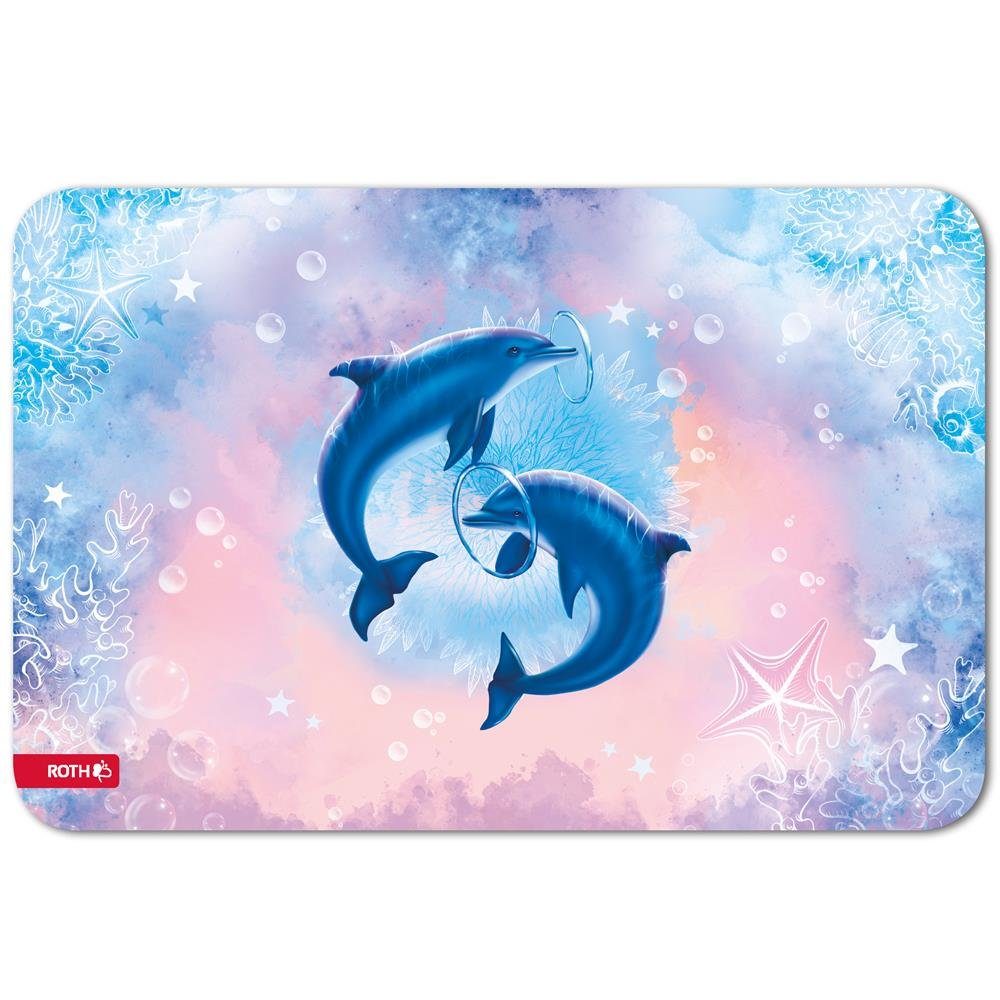 Zwei lustige Delfine tummeln sich zwischen Korallen und Muscheln. Das in zarten Rosa- und Blaunuancen gehaltene Motiv ist besonders schön durch zarte Details, wie vom Meeresgrund aufsteigende Blasen, und wunderschöne Sterne. Die neue Oberfläche und die Anti-Rutsch-Beschichtung auf der Unterseite sorgen für ein angenehmes Gefühl bei allen Schreib- und Malaktivitäten. Durch das abwischbare Material ist die Schreibunterlage leicht zu reinigen. Die Schreibtischmatte mit dem Unterwassermotiv schützt die Tischoberfläche vor Krazern und Flecken. Das Kunstleder dämpft den Lärm der Stifte und ist durch die hohe Qualität langlebig und multifunktional. Die rutschfeste Malunterlage passt in jedes Kinderzimmer und ist ideal als Geschenk für Geburtstag und Schulanfang.
