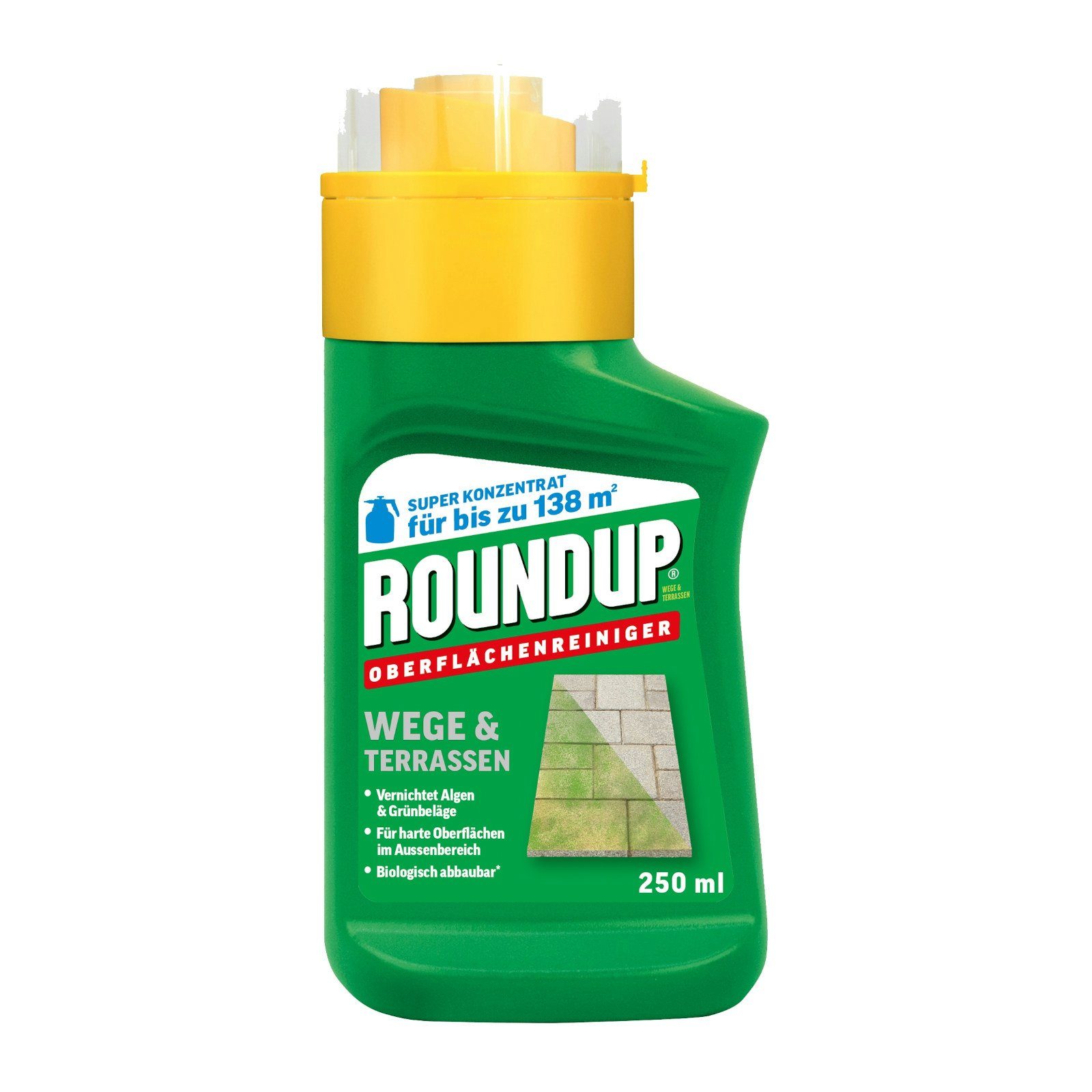 Roundup® Wege & Terrassen Konzentrat ist ein vielseitig einsetzbares Algenbekämpfungsmittel zur Reinigung von Oberflächen im Außenbereich. Eliminiert Grünbeläge und Algen zuverlässig und ist ideal für harte Oberflächen im Außenbereich wie Wege, Terrassen, Auffahrten, Dächer, Gewächshaus, Steinfiguren oder ähnliches.