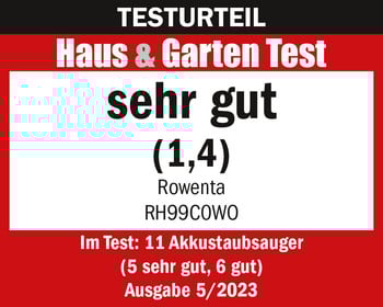 Das Magazin „Haus & Garten Test“ testet den Rowenta RH99COWO im Vergleich mit insgesamt elf Akkustaubsaugern. Die „sehr gute“ Funktion überzeugt: Das Gerät nimmt Grobpartikel, Staub und Fasern „sehr gut“ auf. Die Handhabung ist sehr einfach und das Modell arbeitet sehr leise. Außerdem ist es hervorragend verarbeitet (Bestnote „1,1“). Mit dem Gesamtergebnis „sehr gut (1,4)“ gehört der Akkustaubsauger im Test zum obersten Mittelfeld.