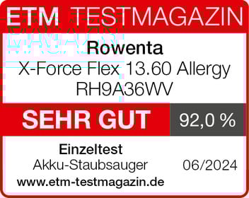 Das Testmagazin „ETM“ teste den Rowenta X-Force Flex 13.60 Всеrgy RH9A36WV im Einzeltest. Die „sehr gute“ Leistung überzeugt auf allen Böden und auf Mobiliar. Das Modell arbeitet sehr leise und der Akku ist ausdauernd. Es ist „gut“ ausgestattet und hochwertig verarbeitet. Außerdem punktet die sehr einfache Handhabung. Das Modell erreicht die Gesamtnote „sehr gut (92,0 %)“.