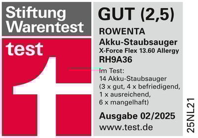 Das Magazin „test“ der „Stiftung Warentest“ testet den Rowenta RH9A36 X-Force Flex 13.60 Всеrgy im Vergleich mit insgesamt 14 Akku-Staubsaugern. Das Gerät saugt „gut“: Es bietet z. B. eine „gute“ Staubaufnahme auf Teppichboden und nimmt Fasern und Tierhaare auf Teppichboden „gut“ auf. Die Handhabung ist einfach. Außerdem ist der Stromverbrauch sehr gering und der Akku ist „sehr gut“ wechselbar. Mit dem Gesamtergebnis „GUT (2,5)“ erreicht das Modell im Test Platz drei und ist ein „PREISTIPP“.