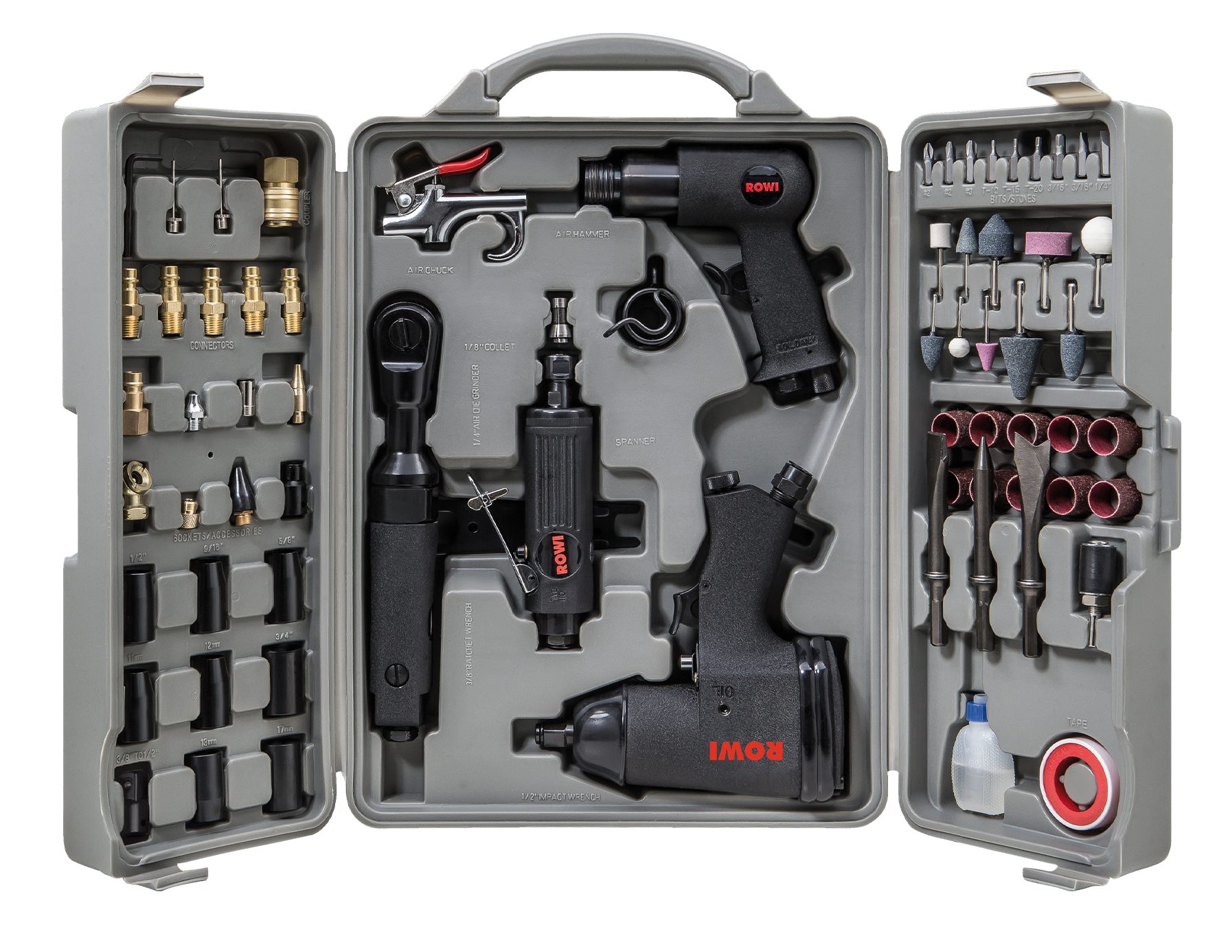 Set beinhaltet | Schlagschrauber, Ratschenschrauber, Meißelhammer, Stabschleifer, Ausblaspistole und 66 Zubehörteile |