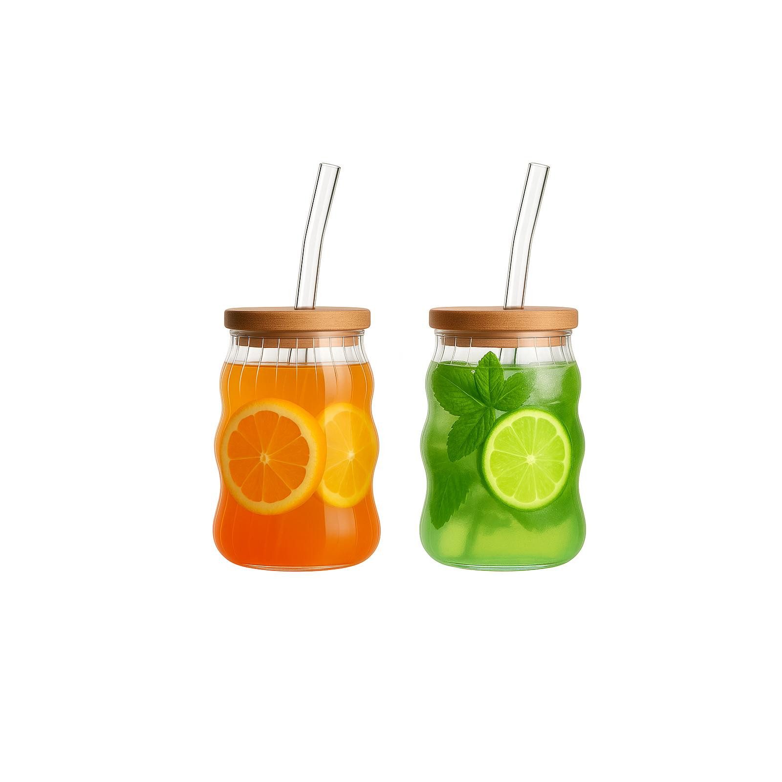 2er Set Cocktailgläser & Trinkgläser 450ml mit Bambusdeckel & Glasstrohhalm – Umweltfreundlich, stilvoll und BPA-frei.