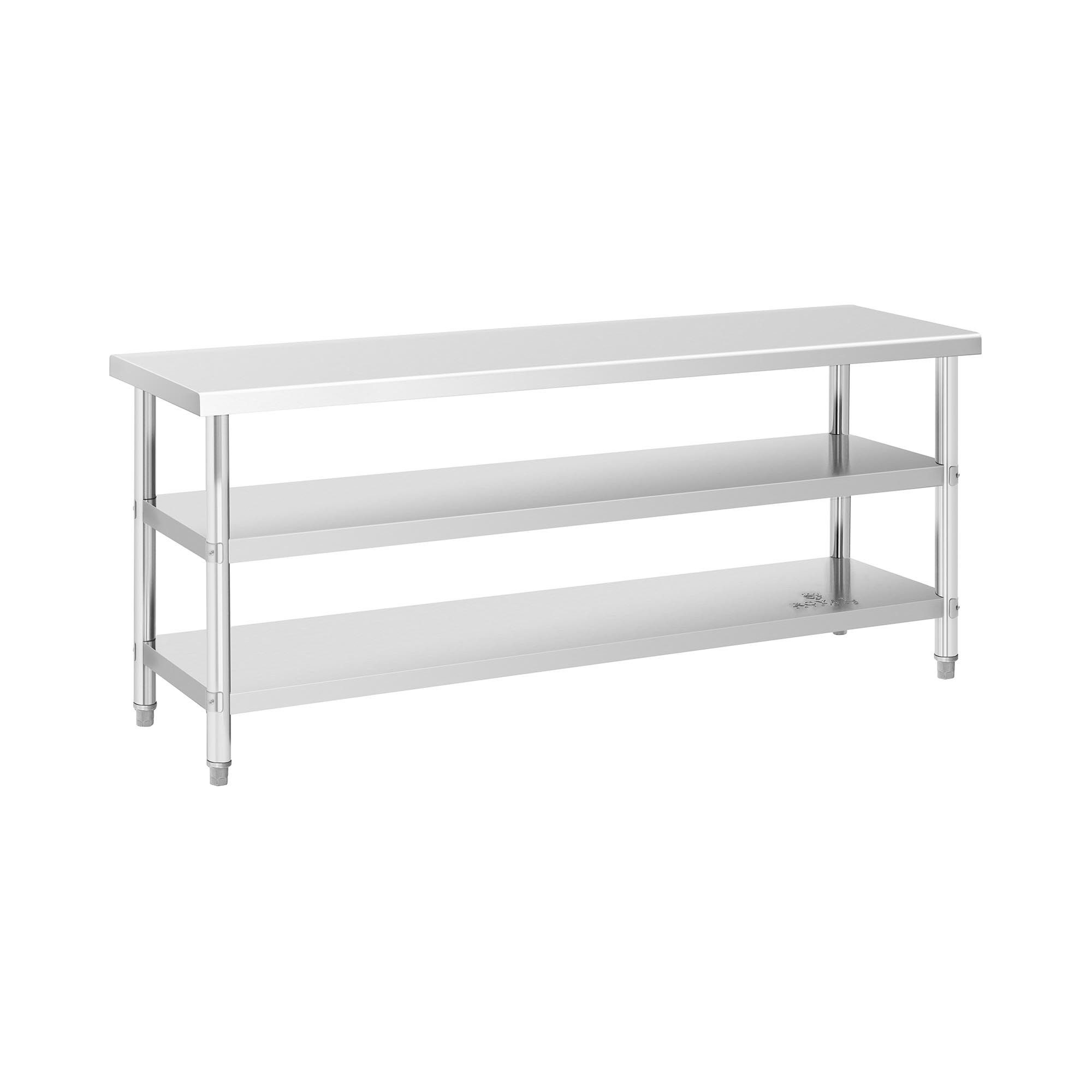 Die Arbeitsfläche des Edelstahltisches beträgt 200 x 60 x 5 cm und sorgt für jede Menge Platz für Ihre tägliche Arbeit. Zwei weitere Ebenen gewährleisten zusätzliche Ablagefläche, wodurch ein gut strukturiertes, übersichtliches Arbeiten ermöglicht wird. Auch größere Gegenstände mit einer Höhe von 29 / 26 cm, können auf diesen Ebenen gelagert werden.