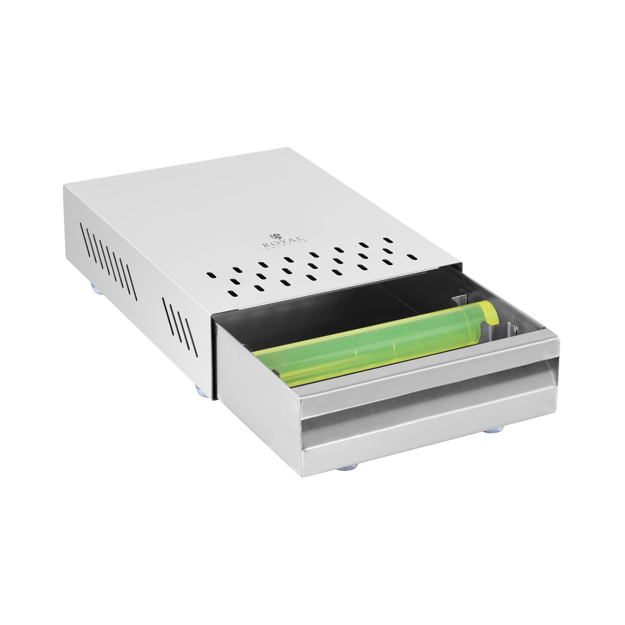 Wie alle Küchengeräte von Royal Catering zeichnet sich auch der Abschlagschublade durch durchdachtes Design in Kombination mit hochwertigen Materialien und sorgfältiger Verarbeitung aus. Mit den Maßen 340 x 240 mm lässt sich die Abklopfbehälter-Schublade perfekt in professionelle Küchen integrieren. Die Tiefe von 70 mm und die Kapazität von 5,7 l sorgen dafür, dass der Behälter nur selten entleert werden muss, was ein effizientes Arbeiten selbst zu Stoßzeiten garantiert. Die integrierte Abklopfstange sorgt für eine vollständige wie schnelle Entleerung des Siebträgers ohne großen Aufwand.