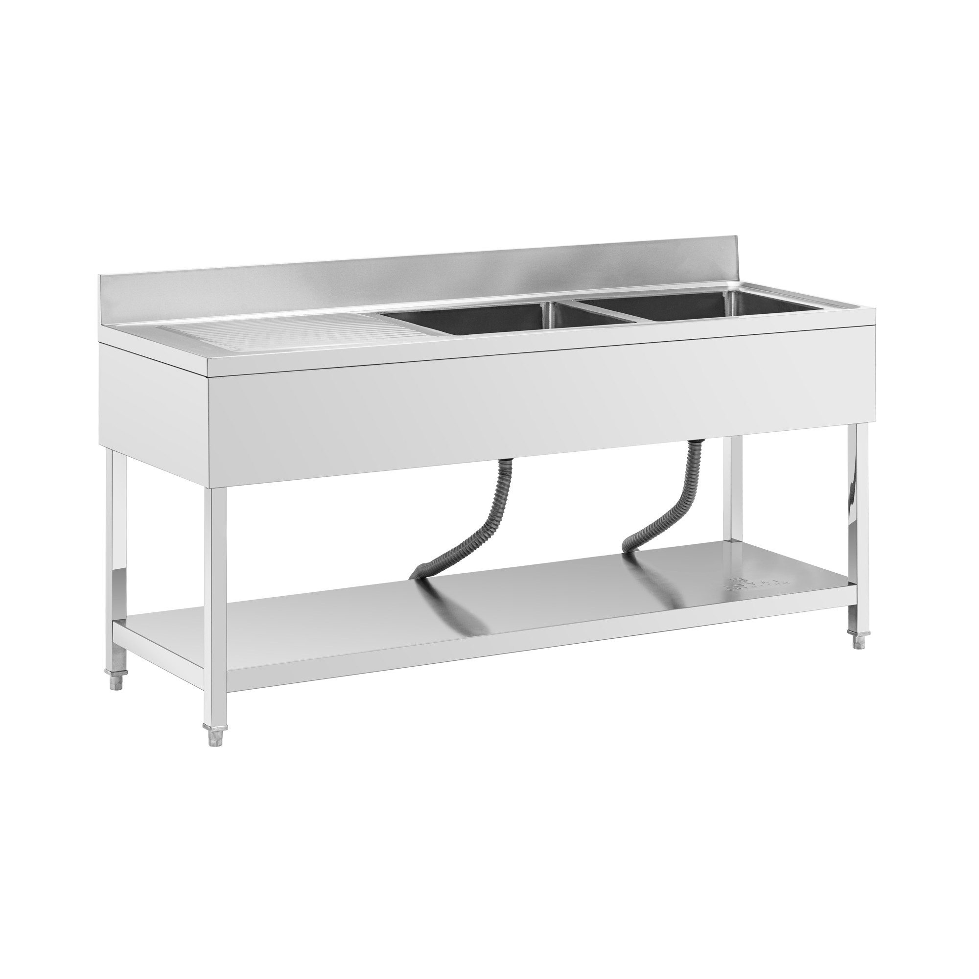 Der Spültisch von Royal Catering ist die ideale Lösung für Großküchen, Restaurants und ähnliche Lokale sowie Labore. Der robuste Edelstahl-Spültisch überzeugt mit zwei besonders großen Spülbecken, einer Abtropffläche und einem geräumigen Unterregal sowie verstellbaren Füßen für einen sicheren Stand auf unebenem Boden.