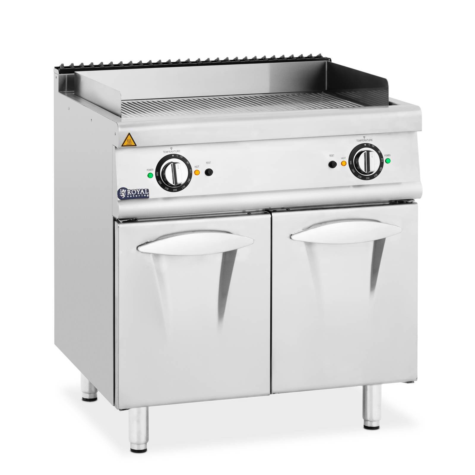 Mit der Elektro-Grillplatte von Royal Catering verwöhnen Sie Ihre Gäste das ganze Jahr über mit herzhaften Grillspezialitäten. Der Grill besticht durch geringe Rauchentwicklung sowie durch eine hygienische und sehr saubere Arbeitsweise. Außerdem eignet sich die elektrische Griddleplatte für den Einsatz in Großküchen – von Restaurants und Imbissen bis hin zu Foodtrucks oder Catering-Veranstaltungen. Unterhalb der Grillfläche finden Sie einen geräumigen Schrank für Töpfe, Pfannen und andere Küchenutensilien, die Sie stets staubgeschützt aufbewahren.