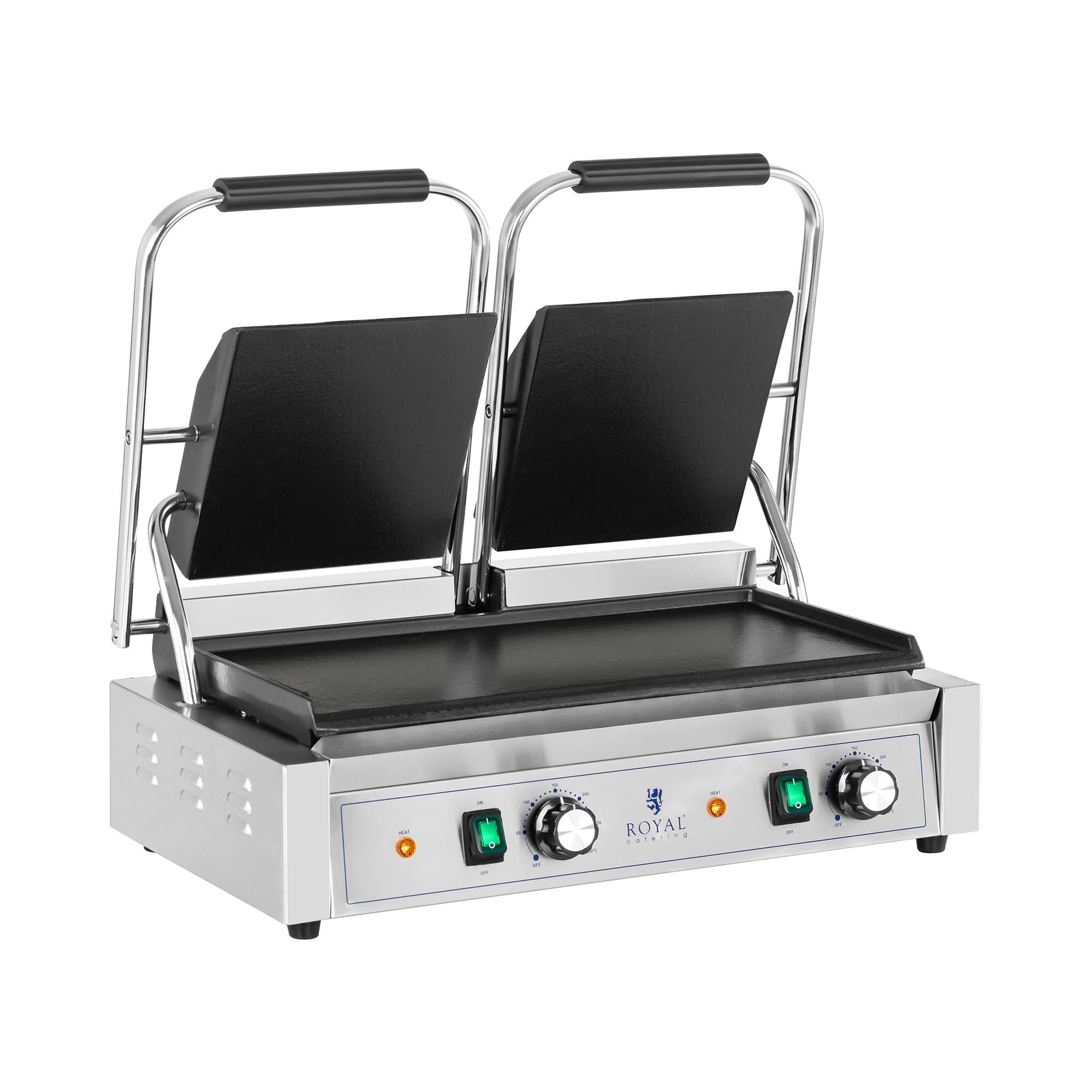 Beide Grillplatten des Profi-Kontaktgrills sind höhenverstellbar und können angepasst werden. Die aus Gusseisen gefertigten Platten verhindern das Ankleben von Lebensmitteln. Durch die glatte Oberfläche eignet sich der Grill perfekt für die Zubereitung von Panini oder Pfannkuchen. Die extragroße Grillfläche mit zwei separat zu öffnenden, oberen Platten bietet viel Platz für Ihr Grillgut. Zudem können Sie das Gerät zum Warmhalten und Grillen gleichzeitig verwenden.