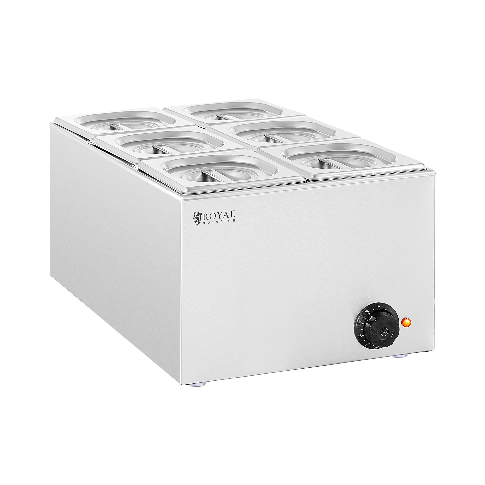Die Bain Marie von Royal Catering hält verschiedenste Gerichte über einen langen Zeitraum perfekt auf Temperatur. In den 6 Gastronormbehältern mit Deckel (GN 1/6) halten Sie parallel alle Komponenten eines Gerichts oder mehrere Speisen wie Fleisch, Fisch, Gemüse, Reis, Kartoffeln und Soße warm, ohne dass sie anbrennen. Der Speisenwärmer deckt optimal den gehobenen Gastronomiebedarf ab und eignet sich für den Einsatz in Restaurants, Hotels, Kantinen, Buffets, Snackbars, Cafeterien oder Seniorenresidenzen und Kliniken.