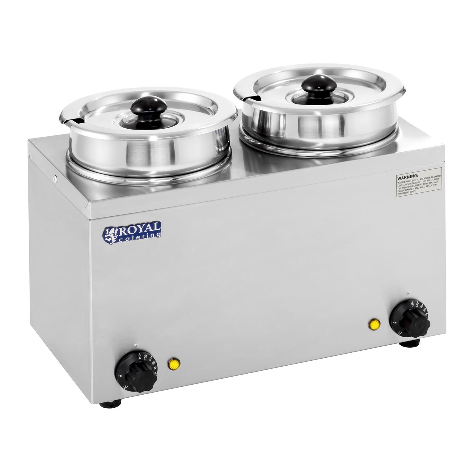 Royal Catering Ihr Spezialist für Gastronomiebedarf stellt Ihnen mit der Suppenstation RCBM-2/4R den perfekten Helfer zum Warmhalten Ihrer Speisen zur Verfügung. Für den professionellen Gebrauch in Restaurants, beispielsweise zum Überbrücken unterschiedlicher Garzeiten, ist der Speisenwärmer gleichermaßen geeignet wie für den Einsatz in Imbissen, Bistros oder Suppenküchen. Die Suppenstation hält Soßen oder Suppen aller Art auf einer konstanten Temperatur.