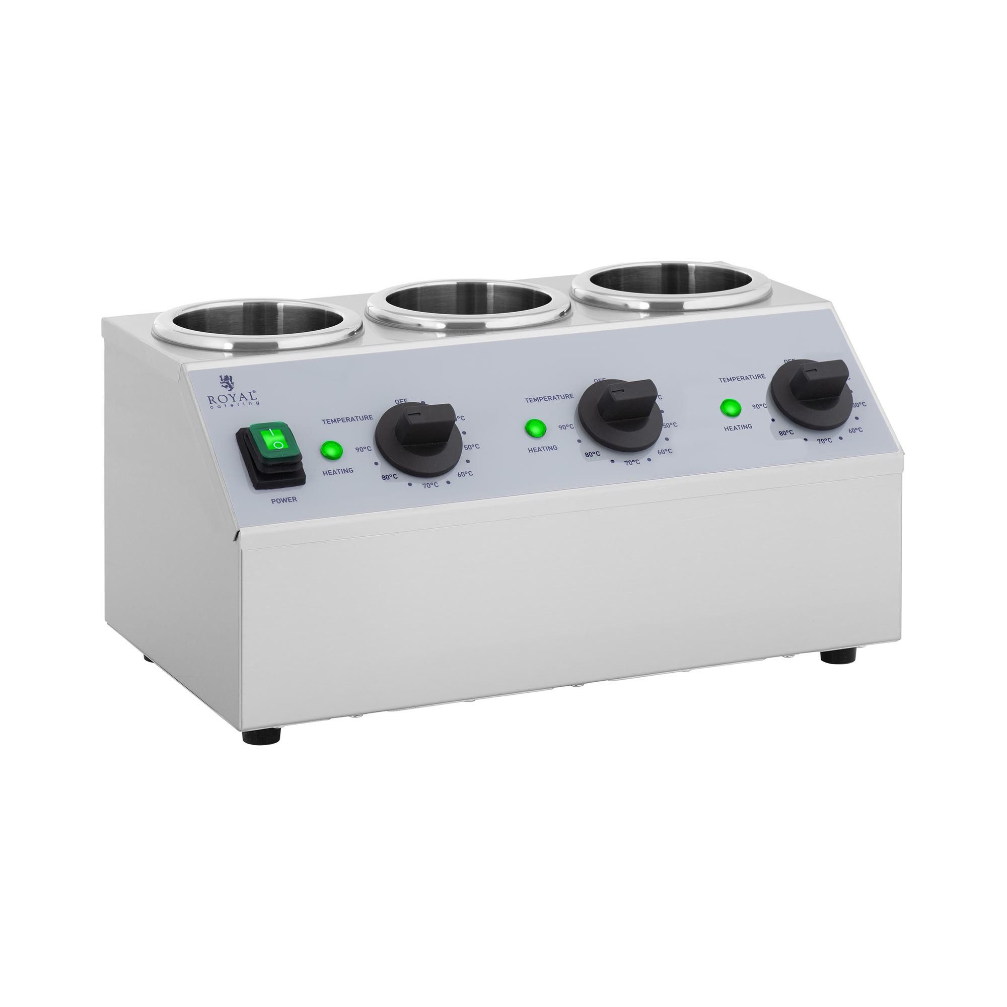 Ihre Kunden lieben warme Soßen? Dann bieten Sie Ihnen einfach zu portionierende, frisch erwärmte Soßen aus der Flasche an! Sie erwärmen die Saucenflaschen schnell und effektiv in dem Soßenwärmer von Royal Catering! Ganz gleich ob Käse-, Chili- oder Barbecuesoßen für Nachos oder Würstchen, in dem Warmhaltegerät sind sie stets wohl temperiert. Aber auch Schokotoppings aus der Flasche für Crêpes oder Waffeln behalten mit dem Schokowärmer immer die richtige Konsistenz.