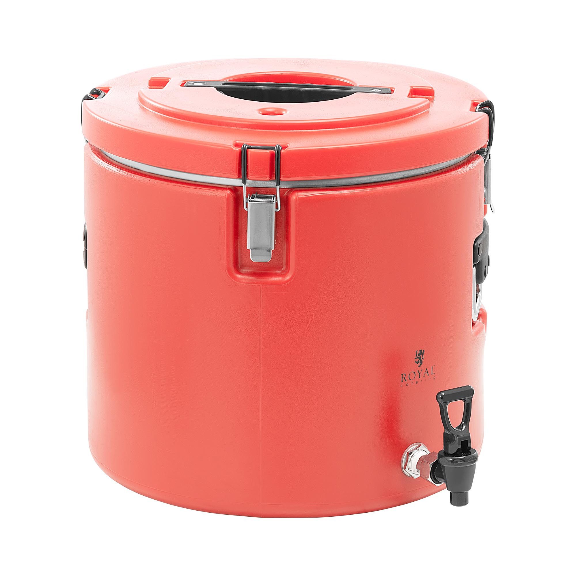 Der Thermobehälter mit Ablasshahn bietet ein Fassungsvermögen von 30 l. Der innere Behälter ist aus hitzebeständigem, hygienischem Edelstahl gefertigt; der äußere aus besonders widerstandsfähigem Kunststoff. Dank der doppelwandigen Isolierung ändert sich die Temperatur von Speisen und Getränken nur um etwa 1 - 2 °C/h. Der Deckel wird mit zwei Spannverschlüssen verschlossen, die eine saubere Beförderung garantieren. Zudem verfügt der Behälter über einen stoßbeständigen Boden sowie zwei Tragmulden für einen einfachen Transport. Um Ihnen das Portionieren zu erleichtern, wurde der Thermobehälter mit einem Ablasshahn für Getränke versehen.