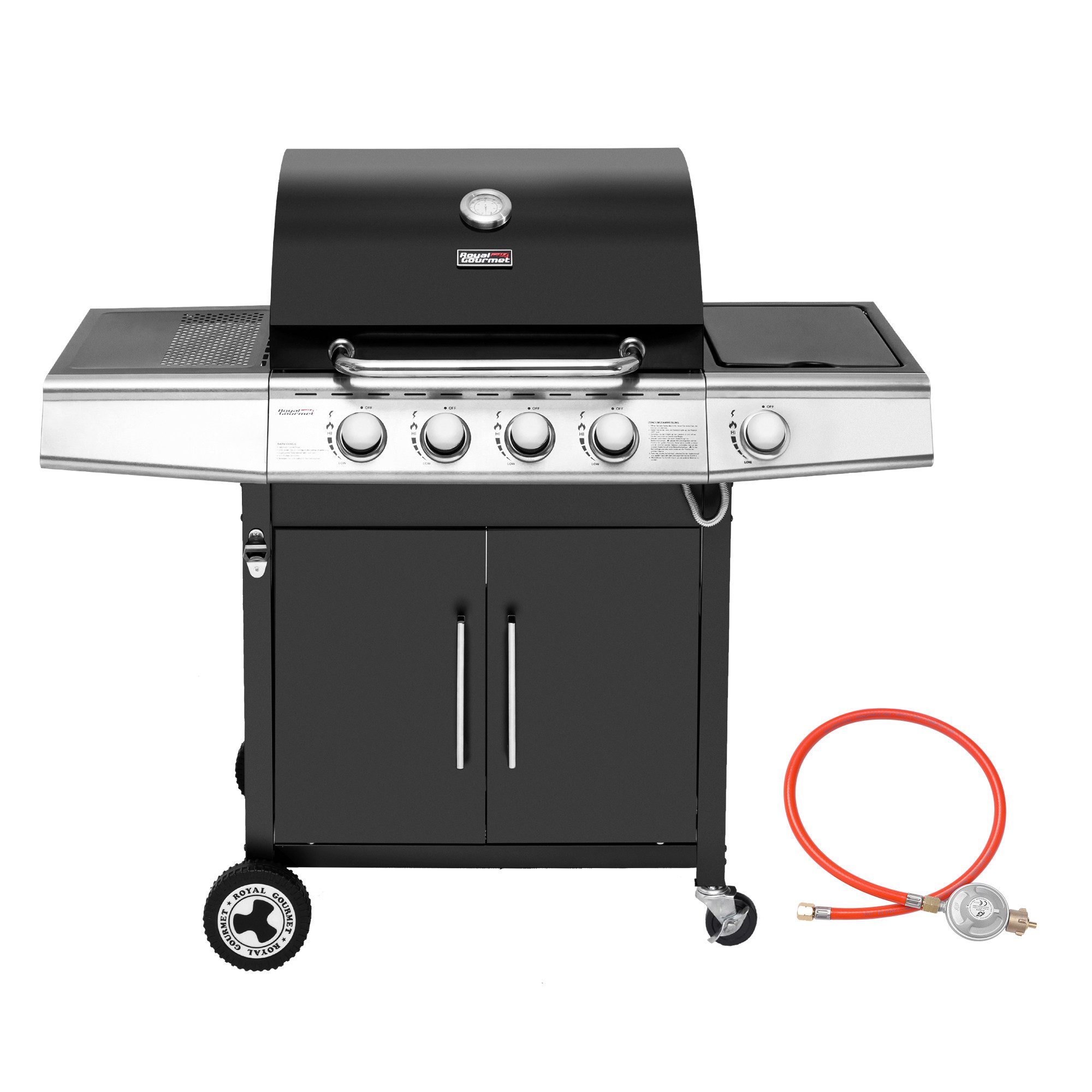 Ausgestattet mit vier Hauptbrennern mit einer Gesamtleistung von 12,0 kW und einem zusätzlichen 2,5 kW Seitenbrenner, bietet der Royal Gourmet® 4-Brenner-Gasgrill vielfältige Einsatzmöglichkeiten. Der Seitenbrenner ermöglicht das einfache Erwärmen und Warmhalten von Saucen, Beilagen und anderen Gerichten. Die großzügigen Beistelltische und der geräumige Unterschrank mit zwei Schwingtüren bieten praktischen Stauraum. Dank der robusten Bauweise und der Kombination aus Lenkrollen und Richtungsrädern lässt sich der Grill mühelos an verschiedene Einsatzorte bewegen.
