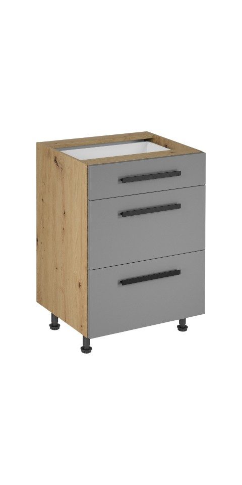 Suchen Sie einen Küchenschrank, der sowohl funktional als auch ästhetisch ansprechend ist? Der untere Küchenschrank Langen D60S3 mit drei Schubladen in Beige vereint beides perfekt.